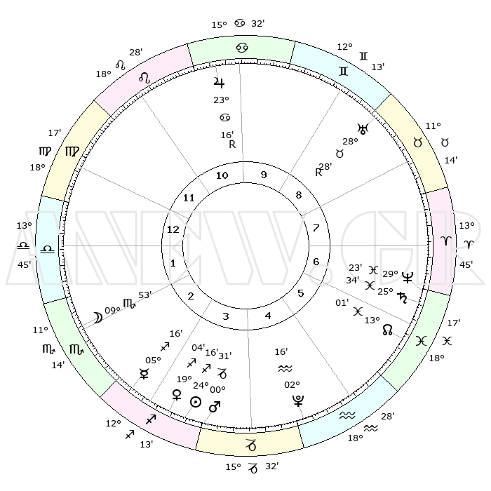 | | ΘΕΣΕΙΣ ΠΛΑΝΗΤΩΝ ΑΣΤΡΟΛΟΓΙΚΟΥ ΧΑΡΤΗ ΤΗΣ ΣΤΙΓΜΗΣ ΑΥΤΗΣ | | | | Πλανήτης | Ζώδιο | Μοίρες | Δεκαήμ. | Σε οίκο | Απόκλιση | | Ακμές των οίκων | | Ηλιος | Τοξότης | 23°23' | Τρίτο | 2 | 23 S 16 | | 1ος | 20°57' | Σκορπιός | | Σελήνη | Ζυγός | 29°35' | Τρίτο | 12 | 14 S 44 | | 2ος | 20°59' | Τοξότης | | Ερμής | Τοξότης | 04°06' | Πρώτο | 1 | 19 S 28 | | 3ος | 25°17' | Αιγόκερως | | Αφροδίτη | Τοξότης | 17°59' | Δεύτερο | 1 | 22 S 44 | | 4ος | 00°57' | Ιχθείς | | Αρης | Τοξότης | 29°52' | Τρίτο | 2 | 24 S 12 | | 5ος | 02°56' | Κριός | | Δίας | Καρκίνος | 23°21'R | Τρίτο | 8 | 21 N 36 | | 6ος | 29°12' | Κριός | | Κρόνος | Ιχθείς | 25°32' | Τρίτο | 4 | 03 S 54 | | 7ος | 20°57' | Ταύρος | | Ουρανός | Ταύρος | 28°30'R | Τρίτο | 7 | 19 N 37 | | 8ος | 20°59' | Δίδυμοι | | Ποσειδώνας | Ιχθείς | 29°23' | Τρίτο | 4 | 01 S 29 | | 9ος | 25°17' | Καρκίνος | | Πλούτωνας | Υδροχόος | 02°15' | Πρώτο | 3 | 23 S 19 | | 10ος | 00°57' | Παρθένος | | Β. Δεσμός | Ιχθείς | 13°04' | Δεύτερο | 4 | 06 S 39 | | 11ος | 02°56' | Ζυγός | | Ωροσκόπος | Σκορπιός | 20°57' | Τρίτο | | | 12ος | 29°12' | Ζυγός | | Μεσουράνημα | Παρθένος | 00°57' | Πρώτο | | | |