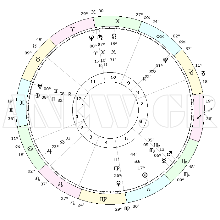 | ΘΕΣΕΙΣ ΠΛΑΝΗΤΩΝ ΑΣΤΡΟΛΟΓΙΚΟΥ ΧΑΡΤΗ ΤΗΣ ΣΤΙΓΜΗΣ ΑΥΤΗΣ | | Πλανήτης | Ζώδιο | Μοίρες | Δεκαήμ. | Σε οίκο | Απόκλιση | | Ακμές των οίκων | Ηλιος | Ζυγός | 17°35' | Δεύτερο | 7 | 06 S 54 | | 1ος | 04°48' | Κριός | Σελήνη | Δίδυμοι | 06°13' | Πρώτο | 2 | 26 N 22 | | 2ος | 13°54' | Ταύρος | Ερμής | Σκορπιός | 05°51' | Πρώτο | 7 | 14 S 39 | | 3ος | 10°35' | Δίδυμοι | Αφροδίτη | Παρθένος | 25°59' | Τρίτο | 6 | 02 N 57 | | 4ος | 02°42' | Καρκίνος | Αρης | Σκορπιός | 12°29' | Δεύτερο | 7 | 15 S 45 | | 5ος | 25°14' | Καρκίνος | Δίας | Καρκίνος | 23°32' | Τρίτο | 4 | 21 N 25 | | 6ος | 23°24' | Λέων | Κρόνος | Ιχθείς | 27°11'R | Τρίτο | 12 | 03 S 25 | | 7ος | 04°48' | Ζυγός | Ουρανός | Δίδυμοι | 00°59'R | Πρώτο | 2 | 20 N 09 | | 8ος | 13°54' | Σκορπιός | Ποσειδώνας | Κριός | 00°17'R | Πρώτο | 12 | 01 S 09 | | 9ος | 10°35' | Τοξότης | Πλούτωνας | Υδροχόος | 01°22'R | Πρώτο | 11 | 23 S 32 | | 10ος | 02°42' | Αιγόκερως | Β. Δεσμός | Ιχθείς | 16°32' | Δεύτερο | 12 | 05 S 19 | | 11ος | 25°14' | Αιγόκερως | Ωροσκόπος | Κριός | 04°48' | Πρώτο | | | 12ος | 23°24' | Υδροχόος | Μεσουράνημα | Αιγόκερως | 02°42' | Πρώτο | | | |