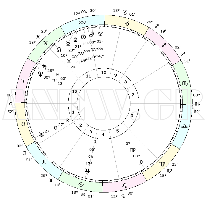 | | ΘΕΣΕΙΣ ΠΛΑΝΗΤΩΝ ΑΣΤΡΟΛΟΓΙΚΟΥ ΧΑΡΤΗ ΤΗΣ ΣΤΙΓΜΗΣ ΑΥΤΗΣ | | | | Πλανήτης | Ζώδιο | Μοίρες | Δεκαήμ. | Σε οίκο | Απόκλιση | | Ακμές των οίκων | | Ηλιος | Υδροχόος | 14°28' | Δεύτερο | 12 | 16 S 29 | | 1ος | 22°09' | Ιχθείς | | Σελήνη | Παρθένος | 02°12' | Πρώτο | 6 | 11 N 16 | | 2ος | 04°14' | Ταύρος | | Ερμής | Υδροχόος | 23°33' | Τρίτο | 12 | 15 S 17 | | 3ος | 02°53' | Δίδυμοι | | Αφροδίτη | Υδροχόος | 21°04' | Τρίτο | 12 | 15 S 47 | | 4ος | 25°35' | Δίδυμοι | | Αρης | Υδροχόος | 08°32' | Πρώτο | 11 | 19 S 08 | | 5ος | 17°36' | Καρκίνος | | Δίας | Καρκίνος | 17°06'R | Δεύτερο | 4 | 22 N 39 | | 6ος | 13°51' | Λέων | | Κρόνος | Ιχθείς | 28°59' | Τρίτο | 1 | 02 S 24 | | 7ος | 22°09' | Παρθένος | | Ουρανός | Ταύρος | 27°27'R | Τρίτο | 2 | 19 N 24 | | 8ος | 04°14' | Σκορπιός | | Ποσειδώνας | Κριός | 00°12' | Πρώτο | 1 | 01 S 07 | | 9ος | 02°53' | Τοξότης | | Πλούτωνας | Υδροχόος | 03°46' | Πρώτο | 11 | 23 S 00 | | 10ος | 25°35' | Τοξότης | | Β. Δεσμός | Ιχθείς | 10°24' | Δεύτερο | 12 | 07 S 40 | | 11ος | 17°36' | Αιγόκερως | | Ωροσκόπος | Ιχθείς | 22°09' | Τρίτο | | | 12ος | 13°51' | Υδροχόος | | Μεσουράνημα | Τοξότης | 25°35' | Τρίτο | | | |
