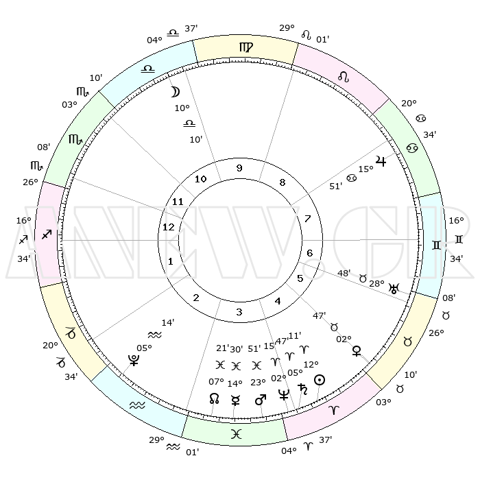 | | ΘΕΣΕΙΣ ΠΛΑΝΗΤΩΝ ΑΣΤΡΟΛΟΓΙΚΟΥ ΧΑΡΤΗ ΤΗΣ ΣΤΙΓΜΗΣ ΑΥΤΗΣ | | | | Πλανήτης | Ζώδιο | Μοίρες | Δεκαήμ. | Σε οίκο | Απόκλιση | | Ακμές των οίκων | | Ηλιος | Κριός | 12°04' | Δεύτερο | 5 | 04 N 46 | | 1ος | 09°01' | Σκορπιός | | Σελήνη | Ζυγός | 08°33' | Πρώτο | 11 | 05 S 46 | | 2ος | 08°01' | Τοξότης | | Ερμής | Ιχθείς | 14°23' | Δεύτερο | 4 | 07 S 28 | | 3ος | 10°49' | Αιγόκερως | | Αφροδίτη | Ταύρος | 02°37' | Πρώτο | 6 | 12 N 00 | | 4ος | 15°39' | Υδροχόος | | Αρης | Ιχθείς | 23°45' | Τρίτο | 5 | 03 S 26 | | 5ος | 18°21' | Ιχθείς | | Δίας | Καρκίνος | 15°50' | Δεύτερο | 9 | 22 N 52 | | 6ος | 16°07' | Κριός | | Κρόνος | Κριός | 05°46' | Πρώτο | 5 | 00 N 20 | | 7ος | 09°01' | Ταύρος | | Ουρανός | Ταύρος | 28°48' | Τρίτο | 7 | 19 N 43 | | 8ος | 08°01' | Δίδυμοι | | Ποσειδώνας | Κριός | 02°14' | Πρώτο | 5 | 00 S 19 | | 9ος | 10°49' | Καρκίνος | | Πλούτωνας | Υδροχόος | 05°14' | Πρώτο | 3 | 22 S 47 | | 10ος | 15°39' | Λέων | | Β. Δεσμός | Ιχθείς | 07°22' | Πρώτο | 4 | 08 S 48 | | 11ος | 18°21' | Παρθένος | | Ωροσκόπος | Σκορπιός | 09°01' | Πρώτο | | | 12ος | 16°07' | Ζυγός | | Μεσουράνημα | Λέων | 15°39' | Δεύτερο | | | |