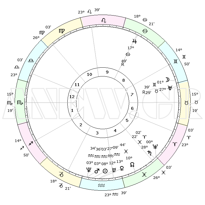 | | ΘΕΣΕΙΣ ΠΛΑΝΗΤΩΝ ΑΣΤΡΟΛΟΓΙΚΟΥ ΧΑΡΤΗ ΤΗΣ ΣΤΙΓΜΗΣ ΑΥΤΗΣ | | | | Πλανήτης | Ζώδιο | Μοίρες | Δεκαήμ. | Σε οίκο | Απόκλιση | | Ακμές των οίκων | | Ηλιος | Υδροχόος | 07°59' | Πρώτο | 4 | 18 S 16 | | 1ος | 25°10' | Ζυγός | | Σελήνη | Δίδυμοι | 00°39' | Πρώτο | 8 | 25 N 19 | | 2ος | 23°17' | Σκορπιός | | Ερμής | Υδροχόος | 12°19' | Δεύτερο | 4 | 19 S 04 | | 3ος | 24°54' | Τοξότης | | Αφροδίτη | Υδροχόος | 13°04' | Δεύτερο | 4 | 18 S 08 | | 4ος | 28°46' | Αιγόκερως | | Αρης | Υδροχόος | 03°33' | Πρώτο | 4 | 20 S 21 | | 5ος | 01°43' | Ιχθείς | | Δίας | Καρκίνος | 17°50'R | Δεύτερο | 9 | 22 N 32 | | 6ος | 00°48' | Κριός | | Κρόνος | Ιχθείς | 28°22' | Τρίτο | 5 | 02 S 39 | | 7ος | 25°10' | Κριός | | Ουρανός | Ταύρος | 27°29'R | Τρίτο | 8 | 19 N 24 | | 8ος | 23°17' | Ταύρος | | Ποσειδώνας | Κριός | 00°02' | Πρώτο | 5 | 01 S 12 | | 9ος | 24°54' | Δίδυμοι | | Πλούτωνας | Υδροχόος | 03°34' | Πρώτο | 4 | 23 S 03 | | 10ος | 28°46' | Καρκίνος | | Β. Δεσμός | Ιχθείς | 10°45' | Δεύτερο | 5 | 07 S 32 | | 11ος | 01°43' | Παρθένος | | Ωροσκόπος | Ζυγός | 25°10' | Τρίτο | | | 12ος | 00°48' | Ζυγός | | Μεσουράνημα | Καρκίνος | 28°46' | Τρίτο | | | |