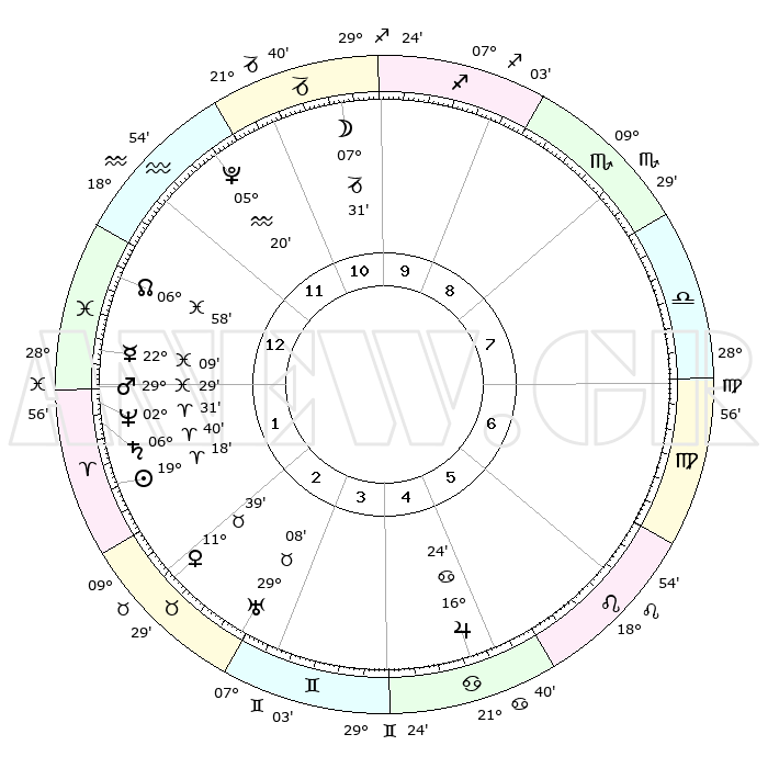 | | ΘΕΣΕΙΣ ΠΛΑΝΗΤΩΝ ΑΣΤΡΟΛΟΓΙΚΟΥ ΧΑΡΤΗ ΤΗΣ ΣΤΙΓΜΗΣ ΑΥΤΗΣ | | | | Πλανήτης | Ζώδιο | Μοίρες | Δεκαήμ. | Σε οίκο | Απόκλιση | | Ακμές των οίκων | | Ηλιος | Κριός | 19°14' | Δεύτερο | 2 | 07 N 32 | | 1ος | 25°54' | Υδροχόος | | Σελήνη | Αιγόκερως | 06°49' | Πρώτο | 11 | 27 S 47 | | 2ος | 11°35' | Κριός | | Ερμής | Ιχθείς | 22°04' | Τρίτο | 1 | 05 S 14 | | 3ος | 15°06' | Ταύρος | | Αφροδίτη | Ταύρος | 11°34' | Δεύτερο | 2 | 15 N 13 | | 4ος | 09°56' | Δίδυμοι | | Αρης | Ιχθείς | 29°26' | Τρίτο | 1 | 01 S 09 | | 5ος | 01°39' | Καρκίνος | | Δίας | Καρκίνος | 16°24' | Δεύτερο | 5 | 22 N 48 | | 6ος | 24°48' | Καρκίνος | | Κρόνος | Κριός | 06°40' | Πρώτο | 1 | 00 N 41 | | 7ος | 25°54' | Λέων | | Ουρανός | Ταύρος | 29°08' | Τρίτο | 3 | 19 N 48 | | 8ος | 11°35' | Ζυγός | | Ποσειδώνας | Κριός | 02°31' | Πρώτο | 1 | 00 S 12 | | 9ος | 15°06' | Σκορπιός | | Πλούτωνας | Υδροχόος | 05°20' | Πρώτο | 12 | 22 S 47 | | 10ος | 09°56' | Τοξότης | | Β. Δεσμός | Ιχθείς | 06°59' | Πρώτο | 1 | 08 S 57 | | 11ος | 01°39' | Αιγόκερως | | Ωροσκόπος | Υδροχόος | 25°54' | Τρίτο | | | 12ος | 24°48' | Αιγόκερως | | Μεσουράνημα | Τοξότης | 09°56' | Πρώτο | | | |