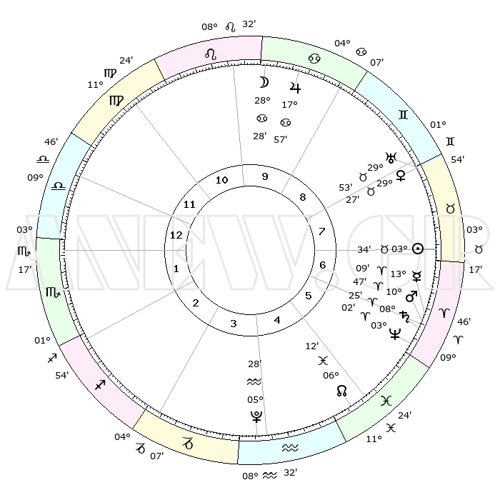 | | ΘΕΣΕΙΣ ΠΛΑΝΗΤΩΝ ΑΣΤΡΟΛΟΓΙΚΟΥ ΧΑΡΤΗ ΤΗΣ ΣΤΙΓΜΗΣ ΑΥΤΗΣ | | | | Πλανήτης | Ζώδιο | Μοίρες | Δεκαήμ. | Σε οίκο | Απόκλιση | | Ακμές των οίκων | | Ηλιος | Ταύρος | 03°31' | Πρώτο | 7 | 12 N 41 | | 1ος | 18°05' | Ζυγός | | Σελήνη | Καρκίνος | 27°45' | Τρίτο | 10 | 23 N 48 | | 2ος | 15°48' | Σκορπιός | | Ερμής | Κριός | 13°04' | Δεύτερο | 6 | 02 N 51 | | 3ος | 16°60' | Τοξότης | | Αφροδίτη | Ταύρος | 29°23' | Τρίτο | 8 | 20 N 34 | | 4ος | 20°30' | Αιγόκερως | | Αρης | Κριός | 10°44' | Δεύτερο | 6 | 03 N 23 | | 5ος | 23°26' | Υδροχόος | | Δίας | Καρκίνος | 17°57' | Δεύτερο | 9 | 22 N 37 | | 6ος | 23°01' | Ιχθείς | | Κρόνος | Κριός | 08°25' | Πρώτο | 6 | 01 N 21 | | 7ος | 18°05' | Κριός | | Ουρανός | Ταύρος | 29°53' | Τρίτο | 8 | 19 N 57 | | 8ος | 15°48' | Ταύρος | | Ποσειδώνας | Κριός | 03°01' | Πρώτο | 6 | 00 S 00 | | 9ος | 16°60' | Δίδυμοι | | Πλούτωνας | Υδροχόος | 05°28' | Πρώτο | 4 | 22 S 48 | | 10ος | 20°30' | Καρκίνος | | Β. Δεσμός | Ιχθείς | 06°12' | Πρώτο | 5 | 09 S 14 | | 11ος | 23°26' | Λέων | | Ωροσκόπος | Ζυγός | 18°05' | Δεύτερο | | | 12ος | 23°01' | Παρθένος | | Μεσουράνημα | Καρκίνος | 20°30' | Τρίτο | | | |