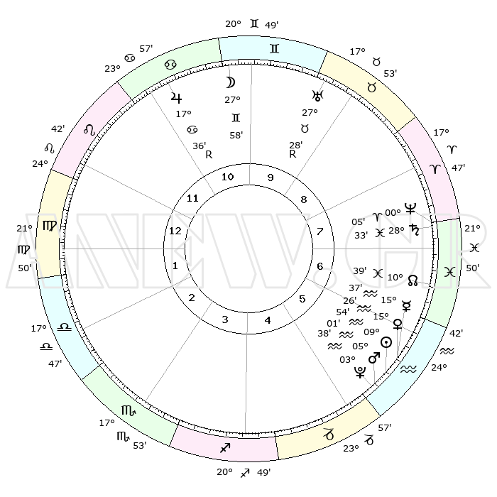 | | ΘΕΣΕΙΣ ΠΛΑΝΗΤΩΝ ΑΣΤΡΟΛΟΓΙΚΟΥ ΧΑΡΤΗ ΤΗΣ ΣΤΙΓΜΗΣ ΑΥΤΗΣ | | | | Πλανήτης | Ζώδιο | Μοίρες | Δεκαήμ. | Σε οίκο | Απόκλιση | | Ακμές των οίκων | | Ηλιος | Υδροχόος | 09°50' | Πρώτο | 6 | 17 S 47 | | 1ος | 02°54' | Παρθένος | | Σελήνη | Δίδυμοι | 27°01' | Τρίτο | 10 | 28 N 21 | | 2ος | 27°03' | Παρθένος | | Ερμής | Υδροχόος | 15°30' | Δεύτερο | 6 | 18 S 05 | | 3ος | 25°58' | Ζυγός | | Αφροδίτη | Υδροχόος | 15°21' | Δεύτερο | 6 | 17 S 30 | | 4ος | 28°55' | Σκορπιός | | Αρης | Υδροχόος | 04°58' | Πρώτο | 6 | 20 S 01 | | 5ος | 02°55' | Αιγόκερως | | Δίας | Καρκίνος | 17°37'R | Δεύτερο | 11 | 22 N 34 | | 6ος | 04°39' | Υδροχόος | | Κρόνος | Ιχθείς | 28°32' | Τρίτο | 8 | 02 S 35 | | 7ος | 02°54' | Ιχθείς | | Ουρανός | Ταύρος | 27°28'R | Τρίτο | 9 | 19 N 24 | | 8ος | 27°03' | Ιχθείς | | Ποσειδώνας | Κριός | 00°05' | Πρώτο | 8 | 01 S 11 | | 9ος | 25°59' | Κριός | | Πλούτωνας | Υδροχόος | 03°38' | Πρώτο | 5 | 23 S 02 | | 10ος | 28°55' | Ταύρος | | Β. Δεσμός | Ιχθείς | 10°39' | Δεύτερο | 7 | 07 S 34 | | 11ος | 02°55' | Καρκίνος | | Ωροσκόπος | Παρθένος | 02°54' | Πρώτο | | | 12ος | 04°39' | Λέων | | Μεσουράνημα | Ταύρος | 28°55' | Τρίτο | | | |