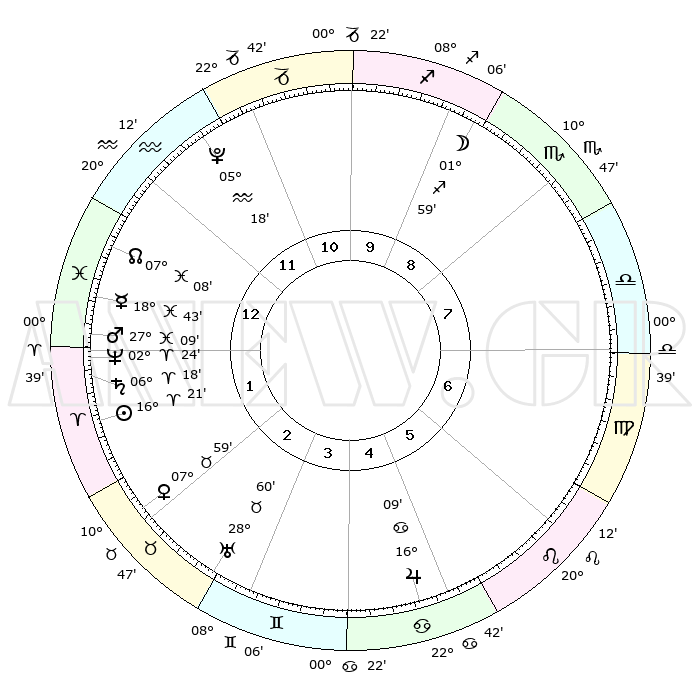 | | ΘΕΣΕΙΣ ΠΛΑΝΗΤΩΝ ΑΣΤΡΟΛΟΓΙΚΟΥ ΧΑΡΤΗ ΤΗΣ ΣΤΙΓΜΗΣ ΑΥΤΗΣ | | | | Πλανήτης | Ζώδιο | Μοίρες | Δεκαήμ. | Σε οίκο | Απόκλιση | | Ακμές των οίκων | | Ηλιος | Κριός | 16°18' | Δεύτερο | 2 | 06 N 24 | | 1ος | 24°31' | Υδροχόος | | Σελήνη | Τοξότης | 01°13' | Πρώτο | 9 | 25 S 25 | | 2ος | 10°15' | Κριός | | Ερμής | Ιχθείς | 18°38' | Δεύτερο | 1 | 06 S 19 | | 3ος | 14°04' | Ταύρος | | Αφροδίτη | Ταύρος | 07°54' | Πρώτο | 2 | 13 N 55 | | 4ος | 09°02' | Δίδυμοι | | Αρης | Ιχθείς | 27°06' | Τρίτο | 1 | 02 S 06 | | 5ος | 00°46' | Καρκίνος | | Δίας | Καρκίνος | 16°09' | Δεύτερο | 5 | 22 N 50 | | 6ος | 23°48' | Καρκίνος | | Κρόνος | Κριός | 06°18' | Πρώτο | 1 | 00 N 32 | | 7ος | 24°31' | Λέων | | Ουρανός | Ταύρος | 28°60' | Τρίτο | 3 | 19 N 46 | | 8ος | 10°15' | Ζυγός | | Ποσειδώνας | Κριός | 02°24' | Πρώτο | 1 | 00 S 15 | | 9ος | 14°04' | Σκορπιός | | Πλούτωνας | Υδροχόος | 05°18' | Πρώτο | 12 | 22 S 47 | | 10ος | 09°02' | Τοξότης | | Β. Δεσμός | Ιχθείς | 07°08' | Πρώτο | 1 | 08 S 53 | | 11ος | 00°46' | Αιγόκερως | | Ωροσκόπος | Υδροχόος | 24°31' | Τρίτο | | | 12ος | 23°48' | Αιγόκερως | | Μεσουράνημα | Τοξότης | 09°02' | Πρώτο | | | |