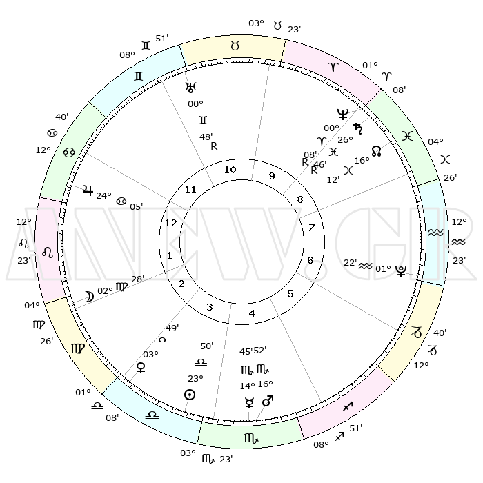 | ΘΕΣΕΙΣ ΠΛΑΝΗΤΩΝ ΑΣΤΡΟΛΟΓΙΚΟΥ ΧΑΡΤΗ ΤΗΣ ΣΤΙΓΜΗΣ ΑΥΤΗΣ | | Πλανήτης | Ζώδιο | Μοίρες | Δεκαήμ. | Σε οίκο | Απόκλιση | | Ακμές των οίκων | Ηλιος | Ζυγός | 23°43' | Τρίτο | 4 | 09 S 12 | | 1ος | 08°44' | Καρκίνος | Σελήνη | Παρθένος | 01°02' | Πρώτο | 3 | 12 N 31 | | 2ος | 29°11' | Καρκίνος | Ερμής | Σκορπιός | 14°36' | Δεύτερο | 5 | 18 S 03 | | 3ος | 21°41' | Λέων | Αφροδίτη | Ζυγός | 03°40' | Πρώτο | 4 | 00 S 04 | | 4ος | 19°27' | Παρθένος | Αρης | Σκορπιός | 16°47' | Δεύτερο | 5 | 17 S 05 | | 5ος | 24°35' | Ζυγός | Δίας | Καρκίνος | 24°05' | Τρίτο | 1 | 21 N 20 | | 6ος | 03°42' | Τοξότης | Κρόνος | Ιχθείς | 26°46'R | Τρίτο | 10 | 03 S 35 | | 7ος | 08°44' | Αιγόκερως | Ουρανός | Δίδυμοι | 00°48'R | Πρώτο | 11 | 20 N 06 | | 8ος | 29°11' | Αιγόκερως | Ποσειδώνας | Κριός | 00°08'R | Πρώτο | 10 | 01 S 12 | | 9ος | 21°41' | Υδροχόος | Πλούτωνας | Υδροχόος | 01°22' | Πρώτο | 8 | 23 S 32 | | 10ος | 19°27' | Ιχθείς | Β. Δεσμός | Ιχθείς | 16°12' | Δεύτερο | 9 | 05 S 27 | | 11ος | 24°35' | Κριός | Ωροσκόπος | Καρκίνος | 08°44' | Πρώτο | | | 12ος | 03°42' | Δίδυμοι | Μεσουράνημα | Ιχθείς | 19°27' | Δεύτερο | | | |