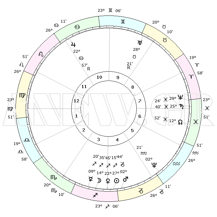 | | ΘΕΣΕΙΣ ΠΛΑΝΗΤΩΝ ΑΣΤΡΟΛΟΓΙΚΟΥ ΧΑΡΤΗ ΤΗΣ ΣΤΙΓΜΗΣ ΑΥΤΗΣ | | | | Πλανήτης | Ζώδιο | Μοίρες | Δεκαήμ. | Σε οίκο | Απόκλιση | | Ακμές των οίκων | | Ηλιος | Τοξότης | 27°11' | Τρίτο | 4 | 23 S 24 | | 1ος | 04°54' | Παρθένος | | Σελήνη | Τοξότης | 13°49' | Δεύτερο | 4 | 27 S 25 | | 2ος | 29°15' | Παρθένος | | Ερμής | Τοξότης | 09°14' | Πρώτο | 4 | 20 S 48 | | 3ος | 28°20' | Ζυγός | | Αφροδίτη | Τοξότης | 22°40' | Τρίτο | 4 | 23 S 13 | | 4ος | 01°17' | Τοξότης | | Αρης | Αιγόκερως | 02°41' | Πρώτο | 4 | 24 S 12 | | 5ος | 05°10' | Αιγόκερως | | Δίας | Καρκίνος | 22°57'R | Τρίτο | 11 | 21 N 41 | | 6ος | 06°46' | Υδροχόος | | Κρόνος | Ιχθείς | 25°40' | Τρίτο | 7 | 03 S 50 | | 7ος | 04°54' | Ιχθείς | | Ουρανός | Ταύρος | 28°21'R | Τρίτο | 9 | 19 N 36 | | 8ος | 29°15' | Ιχθείς | | Ποσειδώνας | Ιχθείς | 29°24' | Τρίτο | 8 | 01 S 28 | | 9ος | 28°20' | Κριός | | Πλούτωνας | Υδροχόος | 02°21' | Πρώτο | 5 | 23 S 18 | | 10ος | 01°17' | Δίδυμοι | | Β. Δεσμός | Ιχθείς | 12°52' | Δεύτερο | 7 | 06 S 44 | | 11ος | 05°10' | Καρκίνος | | Ωροσκόπος | Παρθένος | 04°54' | Πρώτο | | | 12ος | 06°46' | Λέων | | Μεσουράνημα | Δίδυμοι | 01°17' | Πρώτο | | | |