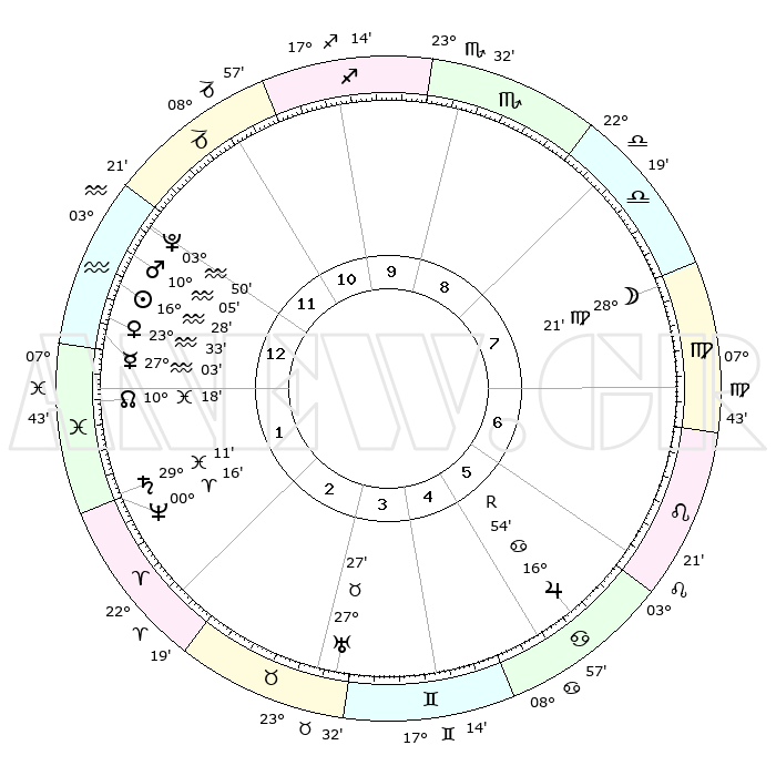 | | ΘΕΣΕΙΣ ΠΛΑΝΗΤΩΝ ΑΣΤΡΟΛΟΓΙΚΟΥ ΧΑΡΤΗ ΤΗΣ ΣΤΙΓΜΗΣ ΑΥΤΗΣ | | | | Πλανήτης | Ζώδιο | Μοίρες | Δεκαήμ. | Σε οίκο | Απόκλιση | | Ακμές των οίκων | | Ηλιος | Υδροχόος | 16°24' | Δεύτερο | 1 | 15 S 55 | | 1ος | 06°40' | Υδροχόος | | Σελήνη | Παρθένος | 27°34' | Τρίτο | 8 | 00 S 34 | | 2ος | 21°43' | Ιχθείς | | Ερμής | Υδροχόος | 26°56' | Τρίτο | 1 | 13 S 58 | | 3ος | 29°01' | Κριός | | Αφροδίτη | Υδροχόος | 23°28' | Τρίτο | 1 | 15 S 02 | | 4ος | 26°23' | Ταύρος | | Αρης | Υδροχόος | 10°02' | Δεύτερο | 1 | 18 S 45 | | 5ος | 18°43' | Δίδυμοι | | Δίας | Καρκίνος | 16°54'R | Δεύτερο | 6 | 22 N 40 | | 6ος | 10°26' | Καρκίνος | | Κρόνος | Ιχθείς | 29°11' | Τρίτο | 2 | 02 S 19 | | 7ος | 06°40' | Λέων | | Ουρανός | Ταύρος | 27°27' | Τρίτο | 4 | 19 N 24 | | 8ος | 21°43' | Παρθένος | | Ποσειδώνας | Κριός | 00°16' | Πρώτο | 2 | 01 S 06 | | 9ος | 29°01' | Ζυγός | | Πλούτωνας | Υδροχόος | 03°50' | Πρώτο | 12 | 23 S 00 | | 10ος | 26°23' | Σκορπιός | | Β. Δεσμός | Ιχθείς | 10°18' | Δεύτερο | 1 | 07 S 42 | | 11ος | 18°43' | Τοξότης | | Ωροσκόπος | Υδροχόος | 06°40' | Πρώτο | | | 12ος | 10°26' | Αιγόκερως | | Μεσουράνημα | Σκορπιός | 26°23' | Τρίτο | | | |