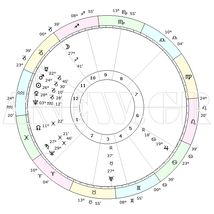 | | ΘΕΣΕΙΣ ΠΛΑΝΗΤΩΝ ΑΣΤΡΟΛΟΓΙΚΟΥ ΧΑΡΤΗ ΤΗΣ ΣΤΙΓΜΗΣ ΑΥΤΗΣ | | | | Πλανήτης | Ζώδιο | Μοίρες | Δεκαήμ. | Σε οίκο | Απόκλιση | | Ακμές των οίκων | | Ηλιος | Αιγόκερως | 26°06' | Τρίτο | 1 | 20 S 55 | | 1ος | 24°53' | Αιγόκερως | | Σελήνη | Τοξότης | 26°54' | Τρίτο | 11 | 28 S 18 | | 2ος | 08°03' | Ιχθείς | | Ερμής | Αιγόκερως | 22°39' | Τρίτο | 12 | 23 S 21 | | 3ος | 17°14' | Κριός | | Αφροδίτη | Αιγόκερως | 28°23' | Τρίτο | 1 | 21 S 28 | | 4ος | 16°36' | Ταύρος | | Αρης | Αιγόκερως | 24°27' | Τρίτο | 12 | 22 S 11 | | 5ος | 09°47' | Δίδυμοι | | Δίας | Καρκίνος | 19°19'R | Δεύτερο | 6 | 22 N 19 | | 6ος | 01°03' | Καρκίνος | | Κρόνος | Ιχθείς | 27°21' | Τρίτο | 2 | 03 S 05 | | 7ος | 24°53' | Καρκίνος | | Ουρανός | Ταύρος | 27°37'R | Τρίτο | 4 | 19 N 26 | | 8ος | 08°03' | Παρθένος | | Ποσειδώνας | Ιχθείς | 29°46' | Τρίτο | 2 | 01 S 19 | | 9ος | 17°14' | Ζυγός | | Πλούτωνας | Υδροχόος | 03°12' | Πρώτο | 1 | 23 S 07 | | 10ος | 16°36' | Σκορπιός | | Β. Δεσμός | Ιχθείς | 11°22' | Δεύτερο | 2 | 07 S 18 | | 11ος | 09°47' | Τοξότης | | Ωροσκόπος | Αιγόκερως | 24°53' | Τρίτο | | | 12ος | 01°03' | Αιγόκερως | | Μεσουράνημα | Σκορπιός | 16°36' | Δεύτερο | | | |