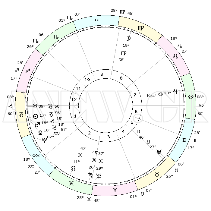 | | ΘΕΣΕΙΣ ΠΛΑΝΗΤΩΝ ΑΣΤΡΟΛΟΓΙΚΟΥ ΧΑΡΤΗ ΤΗΣ ΣΤΙΓΜΗΣ ΑΥΤΗΣ | | | | Πλανήτης | Ζώδιο | Μοίρες | Δεκαήμ. | Σε οίκο | Απόκλιση | | Ακμές των οίκων | | Ηλιος | Αιγόκερως | 16°52' | Δεύτερο | 1 | 22 S 22 | | 1ος | 23°27' | Τοξότης | | Σελήνη | Παρθένος | 06°16' | Πρώτο | 8 | 09 N 33 | | 2ος | 29°00' | Αιγόκερως | | Ερμής | Αιγόκερως | 08°12' | Πρώτο | 1 | 24 S 22 | | 3ος | 08°23' | Ιχθείς | | Αφροδίτη | Αιγόκερως | 16°59' | Δεύτερο | 1 | 23 S 05 | | 4ος | 13°16' | Κριός | | Αρης | Αιγόκερως | 17°26' | Δεύτερο | 1 | 23 S 13 | | 5ος | 10°39' | Ταύρος | | Δίας | Καρκίνος | 20°32'R | Τρίτο | 7 | 22 N 07 | | 6ος | 02°57' | Δίδυμοι | | Κρόνος | Ιχθείς | 26°40' | Τρίτο | 3 | 03 S 23 | | 7ος | 23°27' | Δίδυμοι | | Ουρανός | Ταύρος | 27°47'R | Τρίτο | 5 | 19 N 28 | | 8ος | 29°00' | Καρκίνος | | Ποσειδώνας | Ιχθείς | 29°36' | Τρίτο | 3 | 01 S 23 | | 9ος | 08°23' | Παρθένος | | Πλούτωνας | Υδροχόος | 02°55' | Πρώτο | 2 | 23 S 11 | | 10ος | 13°16' | Ζυγός | | Β. Δεσμός | Ιχθείς | 11°51' | Δεύτερο | 3 | 07 S 07 | | 11ος | 10°39' | Σκορπιός | | Ωροσκόπος | Τοξότης | 23°27' | Τρίτο | | | 12ος | 02°57' | Τοξότης | | Μεσουράνημα | Ζυγός | 13°16' | Δεύτερο | | | |
