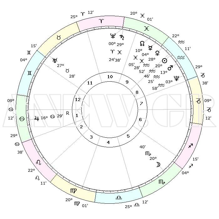 | | ΘΕΣΕΙΣ ΠΛΑΝΗΤΩΝ ΑΣΤΡΟΛΟΓΙΚΟΥ ΧΑΡΤΗ ΤΗΣ ΣΤΙΓΜΗΣ ΑΥΤΗΣ | | | | Πλανήτης | Ζώδιο | Μοίρες | Δεκαήμ. | Σε οίκο | Απόκλιση | | Ακμές των οίκων | | Ηλιος | Υδροχόος | 20°43' | Τρίτο | 9 | 14 S 35 | | 1ος | 21°30' | Δίδυμοι | | Σελήνη | Σκορπιός | 20°02' | Τρίτο | 6 | 22 S 31 | | 2ος | 12°59' | Καρκίνος | | Ερμής | Ιχθείς | 04°23' | Πρώτο | 10 | 10 S 49 | | 3ος | 04°22' | Λέων | | Αφροδίτη | Υδροχόος | 28°48' | Τρίτο | 9 | 13 S 15 | | 4ος | 29°24' | Λέων | | Αρης | Υδροχόος | 13°23' | Δεύτερο | 9 | 17 S 49 | | 5ος | 01°52' | Ζυγός | | Δίας | Καρκίνος | 16°30'R | Δεύτερο | 2 | 22 N 44 | | 6ος | 12°10' | Σκορπιός | | Κρόνος | Ιχθείς | 29°37' | Τρίτο | 10 | 02 S 08 | | 7ος | 21°30' | Τοξότης | | Ουρανός | Ταύρος | 27°28' | Τρίτο | 12 | 19 N 25 | | 8ος | 12°59' | Αιγόκερως | | Ποσειδώνας | Κριός | 00°24' | Πρώτο | 10 | 01 S 03 | | 9ος | 04°22' | Υδροχόος | | Πλούτωνας | Υδροχόος | 03°58' | Πρώτο | 8 | 22 S 58 | | 10ος | 29°24' | Υδροχόος | | Β. Δεσμός | Ιχθείς | 10°05' | Δεύτερο | 10 | 07 S 47 | | 11ος | 01°52' | Κριός | | Ωροσκόπος | Δίδυμοι | 21°30' | Τρίτο | | | 12ος | 12°10' | Ταύρος | | Μεσουράνημα | Υδροχόος | 29°24' | Τρίτο | | | |