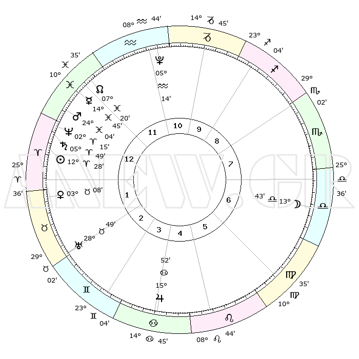 | | ΘΕΣΕΙΣ ΠΛΑΝΗΤΩΝ ΑΣΤΡΟΛΟΓΙΚΟΥ ΧΑΡΤΗ ΤΗΣ ΣΤΙΓΜΗΣ ΑΥΤΗΣ | | | | Πλανήτης | Ζώδιο | Μοίρες | Δεκαήμ. | Σε οίκο | Απόκλιση | | Ακμές των οίκων | | Ηλιος | Κριός | 12°24' | Δεύτερο | 1 | 04 N 54 | | 1ος | 20°09' | Ιχθείς | | Σελήνη | Ζυγός | 12°57' | Δεύτερο | 7 | 07 S 48 | | 2ος | 02°38' | Ταύρος | | Ερμής | Ιχθείς | 14°42' | Δεύτερο | 12 | 07 S 23 | | 3ος | 01°38' | Δίδυμοι | | Αφροδίτη | Ταύρος | 03°03' | Πρώτο | 2 | 12 N 09 | | 4ος | 24°27' | Δίδυμοι | | Αρης | Ιχθείς | 24°01' | Τρίτο | 1 | 03 S 20 | | 5ος | 16°24' | Καρκίνος | | Δίας | Καρκίνος | 15°51' | Δεύτερο | 4 | 22 N 52 | | 6ος | 12°22' | Λέων | | Κρόνος | Κριός | 05°48' | Πρώτο | 1 | 00 N 21 | | 7ος | 20°09' | Παρθένος | | Ουρανός | Ταύρος | 28°49' | Τρίτο | 2 | 19 N 43 | | 8ος | 02°38' | Σκορπιός | | Ποσειδώνας | Κριός | 02°15' | Πρώτο | 1 | 00 S 18 | | 9ος | 01°38' | Τοξότης | | Πλούτωνας | Υδροχόος | 05°14' | Πρώτο | 11 | 22 S 47 | | 10ος | 24°27' | Τοξότης | | Β. Δεσμός | Ιχθείς | 07°21' | Πρώτο | 12 | 08 S 49 | | 11ος | 16°24' | Αιγόκερως | | Ωροσκόπος | Ιχθείς | 20°09' | Τρίτο | | | 12ος | 12°22' | Υδροχόος | | Μεσουράνημα | Τοξότης | 24°27' | Τρίτο | | | |