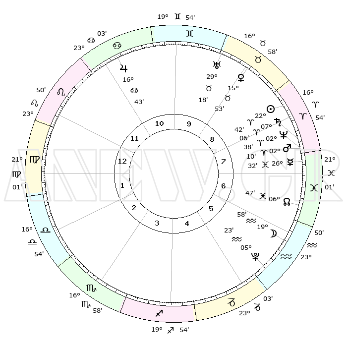 | | ΘΕΣΕΙΣ ΠΛΑΝΗΤΩΝ ΑΣΤΡΟΛΟΓΙΚΟΥ ΧΑΡΤΗ ΤΗΣ ΣΤΙΓΜΗΣ ΑΥΤΗΣ | | | | Πλανήτης | Ζώδιο | Μοίρες | Δεκαήμ. | Σε οίκο | Απόκλιση | | Ακμές των οίκων | | Ηλιος | Κριός | 22°38' | Τρίτο | 8 | 08 N 48 | | 1ος | 03°18' | Παρθένος | | Σελήνη | Υδροχόος | 19°11' | Δεύτερο | 6 | 16 S 40 | | 2ος | 27°30' | Παρθένος | | Ερμής | Ιχθείς | 26°27' | Τρίτο | 7 | 03 S 42 | | 3ος | 26°28' | Ζυγός | | Αφροδίτη | Ταύρος | 15°49' | Δεύτερο | 9 | 16 N 38 | | 4ος | 29°24' | Σκορπιός | | Αρης | Κριός | 02°08' | Πρώτο | 8 | 00 S 04 | | 5ος | 03°23' | Αιγόκερως | | Δίας | Καρκίνος | 16°43' | Δεύτερο | 11 | 22 N 46 | | 6ος | 05°05' | Υδροχόος | | Κρόνος | Κριός | 07°05' | Πρώτο | 8 | 00 N 51 | | 7ος | 03°18' | Ιχθείς | | Ουρανός | Ταύρος | 29°18' | Τρίτο | 9 | 19 N 50 | | 8ος | 27°30' | Ιχθείς | | Ποσειδώνας | Κριός | 02°38' | Πρώτο | 8 | 00 S 09 | | 9ος | 26°28' | Κριός | | Πλούτωνας | Υδροχόος | 05°23' | Πρώτο | 6 | 22 S 47 | | 10ος | 29°24' | Ταύρος | | Β. Δεσμός | Ιχθείς | 06°48' | Πρώτο | 7 | 09 S 01 | | 11ος | 03°23' | Καρκίνος | | Ωροσκόπος | Παρθένος | 03°18' | Πρώτο | | | 12ος | 05°05' | Λέων | | Μεσουράνημα | Ταύρος | 29°24' | Τρίτο | | | |
