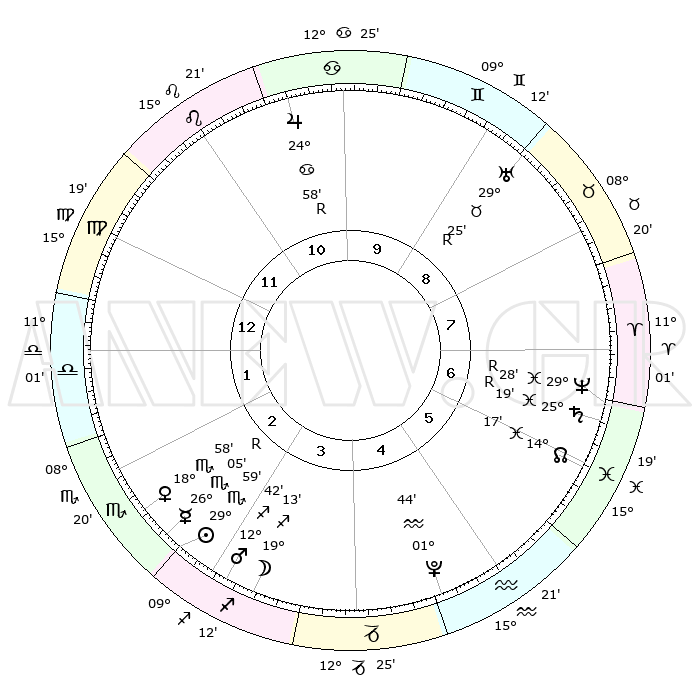 | | ΘΕΣΕΙΣ ΠΛΑΝΗΤΩΝ ΑΣΤΡΟΛΟΓΙΚΟΥ ΧΑΡΤΗ ΤΗΣ ΣΤΙΓΜΗΣ ΑΥΤΗΣ | | | | Πλανήτης | Ζώδιο | Μοίρες | Δεκαήμ. | Σε οίκο | Απόκλιση | | Ακμές των οίκων | | Ηλιος | Σκορπιός | 29°56' | Τρίτο | 3 | 20 S 08 | | 1ος | 26°29' | Παρθένος | | Σελήνη | Τοξότης | 18°37' | Δεύτερο | 3 | 27 S 55 | | 2ος | 22°49' | Ζυγός | | Ερμής | Σκορπιός | 26°09'R | Τρίτο | 3 | 18 S 15 | | 3ος | 23°06' | Σκορπιός | | Αφροδίτη | Σκορπιός | 18°54' | Δεύτερο | 2 | 16 S 28 | | 4ος | 26°03' | Τοξότης | | Αρης | Τοξότης | 12°40' | Δεύτερο | 3 | 22 S 54 | | 5ος | 29°05' | Αιγόκερως | | Δίας | Καρκίνος | 24°58'R | Τρίτο | 10 | 21 N 16 | | 6ος | 29°39' | Υδροχόος | | Κρόνος | Ιχθείς | 25°19'R | Τρίτο | 6 | 04 S 04 | | 7ος | 26°29' | Ιχθείς | | Ουρανός | Ταύρος | 29°25'R | Τρίτο | 9 | 19 N 49 | | 8ος | 22°49' | Κριός | | Ποσειδώνας | Ιχθείς | 29°28'R | Τρίτο | 7 | 01 S 27 | | 9ος | 23°06' | Ταύρος | | Πλούτωνας | Υδροχόος | 01°44' | Πρώτο | 5 | 23 S 27 | | 10ος | 26°03' | Δίδυμοι | | Β. Δεσμός | Ιχθείς | 14°17' | Δεύτερο | 6 | 06 S 11 | | 11ος | 29°05' | Καρκίνος | | Ωροσκόπος | Παρθένος | 26°29' | Τρίτο | | | 12ος | 29°39' | Λέων | | Μεσουράνημα | Δίδυμοι | 26°03' | Τρίτο | | | |