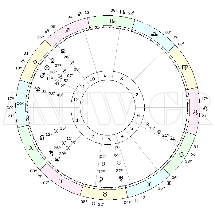 | | ΘΕΣΕΙΣ ΠΛΑΝΗΤΩΝ ΑΣΤΡΟΛΟΓΙΚΟΥ ΧΑΡΤΗ ΤΗΣ ΣΤΙΓΜΗΣ ΑΥΤΗΣ | | | | Πλανήτης | Ζώδιο | Μοίρες | Δεκαήμ. | Σε οίκο | Απόκλιση | | Ακμές των οίκων | | Ηλιος | Αιγόκερως | 08°48' | Πρώτο | 12 | 23 S 08 | | 1ος | 18°37' | Αιγόκερως | | Σελήνη | Ταύρος | 11°04' | Δεύτερο | 4 | 19 N 19 | | 2ος | 00°26' | Ιχθείς | | Ερμής | Τοξότης | 26°02' | Τρίτο | 12 | 23 S 45 | | 3ος | 10°18' | Κριός | | Αφροδίτη | Αιγόκερως | 07°02' | Πρώτο | 12 | 23 S 41 | | 4ος | 10°50' | Ταύρος | | Αρης | Αιγόκερως | 11°22' | Δεύτερο | 12 | 23 S 49 | | 5ος | 04°38' | Δίδυμοι | | Δίας | Καρκίνος | 21°35'R | Τρίτο | 7 | 21 N 56 | | 6ος | 25°50' | Δίδυμοι | | Κρόνος | Ιχθείς | 26°11' | Τρίτο | 2 | 03 S 36 | | 7ος | 18°37' | Καρκίνος | | Ουρανός | Ταύρος | 27°60'R | Τρίτο | 4 | 19 N 31 | | 8ος | 00°26' | Παρθένος | | Ποσειδώνας | Ιχθείς | 29°29' | Τρίτο | 2 | 01 S 26 | | 9ος | 10°18' | Ζυγός | | Πλούτωνας | Υδροχόος | 02°40' | Πρώτο | 1 | 23 S 14 | | 10ος | 10°50' | Σκορπιός | | Β. Δεσμός | Ιχθείς | 12°16' | Δεύτερο | 2 | 06 S 58 | | 11ος | 04°38' | Τοξότης | | Ωροσκόπος | Αιγόκερως | 18°37' | Δεύτερο | | | 12ος | 25°50' | Τοξότης | | Μεσουράνημα | Σκορπιός | 10°50' | Δεύτερο | | | |