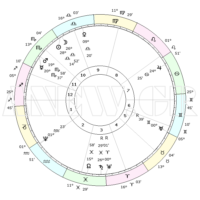 | ΘΕΣΕΙΣ ΠΛΑΝΗΤΩΝ ΑΣΤΡΟΛΟΓΙΚΟΥ ΧΑΡΤΗ ΤΗΣ ΣΤΙΓΜΗΣ ΑΥΤΗΣ | | Πλανήτης | Ζώδιο | Μοίρες | Δεκαήμ. | Σε οίκο | Απόκλιση | | Ακμές των οίκων | Ηλιος | Ζυγός | 27°53' | Τρίτο | 2 | 10 S 43 | | 1ος | 07°44' | Παρθένος | Σελήνη | Ζυγός | 22°29' | Τρίτο | 2 | 11 S 28 | | 2ος | 02°23' | Ζυγός | Ερμής | Σκορπιός | 20°09' | Τρίτο | 3 | 20 S 01 | | 3ος | 01°41' | Σκορπιός | Αφροδίτη | Ζυγός | 08°53' | Πρώτο | 2 | 02 S 07 | | 4ος | 04°38' | Τοξότης | Αρης | Σκορπιός | 19°43' | Δεύτερο | 3 | 17 S 56 | | 5ος | 08°21' | Αιγόκερως | Δίας | Καρκίνος | 24°24' | Τρίτο | 11 | 21 N 18 | | 6ος | 09°46' | Υδροχόος | Κρόνος | Ιχθείς | 26°30'R | Τρίτο | 7 | 03 S 41 | | 7ος | 07°44' | Ιχθείς | Ουρανός | Δίδυμοι | 00°40'R | Πρώτο | 9 | 20 N 05 | | 8ος | 02°23' | Κριός | Ποσειδώνας | Κριός | 00°02'R | Πρώτο | 7 | 01 S 15 | | 9ος | 01°41' | Ταύρος | Πλούτωνας | Υδροχόος | 01°23' | Πρώτο | 5 | 23 S 32 | | 10ος | 04°38' | Δίδυμοι | Β. Δεσμός | Ιχθείς | 15°59' | Δεύτερο | 7 | 05 S 32 | | 11ος | 08°21' | Καρκίνος | Ωροσκόπος | Παρθένος | 07°44' | Πρώτο | | | 12ος | 09°47' | Λέων | Μεσουράνημα | Δίδυμοι | 04°38' | Πρώτο | | | |