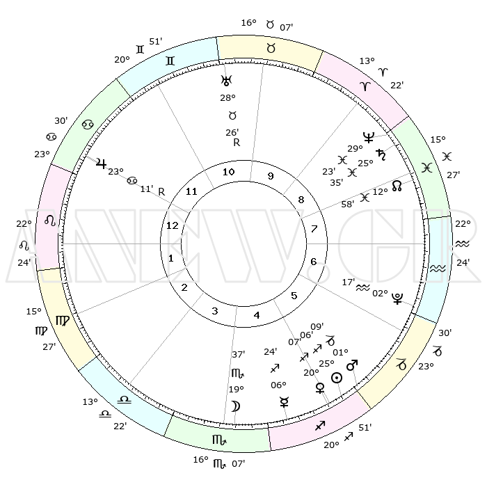 | | ΘΕΣΕΙΣ ΠΛΑΝΗΤΩΝ ΑΣΤΡΟΛΟΓΙΚΟΥ ΧΑΡΤΗ ΤΗΣ ΣΤΙΓΜΗΣ ΑΥΤΗΣ | | | | Πλανήτης | Ζώδιο | Μοίρες | Δεκαήμ. | Σε οίκο | Απόκλιση | | Ακμές των οίκων | | Ηλιος | Τοξότης | 24°45' | Τρίτο | 9 | 23 S 20 | | 1ος | 09°28' | Κριός | | Σελήνη | Σκορπιός | 15°26' | Δεύτερο | 7 | 20 S 43 | | 2ος | 17°21' | Ταύρος | | Ερμής | Τοξότης | 05°55' | Πρώτο | 8 | 19 S 57 | | 3ος | 13°23' | Δίδυμοι | | Αφροδίτη | Τοξότης | 19°40' | Δεύτερο | 9 | 22 S 56 | | 4ος | 05°20' | Καρκίνος | | Αρης | Αιγόκερως | 00°53' | Πρώτο | 9 | 24 S 13 | | 5ος | 28°08' | Καρκίνος | | Δίας | Καρκίνος | 23°13'R | Τρίτο | 4 | 21 N 38 | | 6ος | 27°03' | Λέων | | Κρόνος | Ιχθείς | 25°35' | Τρίτο | 12 | 03 S 53 | | 7ος | 09°28' | Ζυγός | | Ουρανός | Ταύρος | 28°27'R | Τρίτο | 2 | 19 N 37 | | 8ος | 17°21' | Σκορπιός | | Ποσειδώνας | Ιχθείς | 29°23' | Τρίτο | 12 | 01 S 29 | | 9ος | 13°23' | Τοξότης | | Πλούτωνας | Υδροχόος | 02°17' | Πρώτο | 11 | 23 S 19 | | 10ος | 05°20' | Αιγόκερως | | Β. Δεσμός | Ιχθείς | 12°60' | Δεύτερο | 12 | 06 S 41 | | 11ος | 28°08' | Αιγόκερως | | Ωροσκόπος | Κριός | 09°28' | Πρώτο | | | 12ος | 27°03' | Υδροχόος | | Μεσουράνημα | Αιγόκερως | 05°20' | Πρώτο | | | |