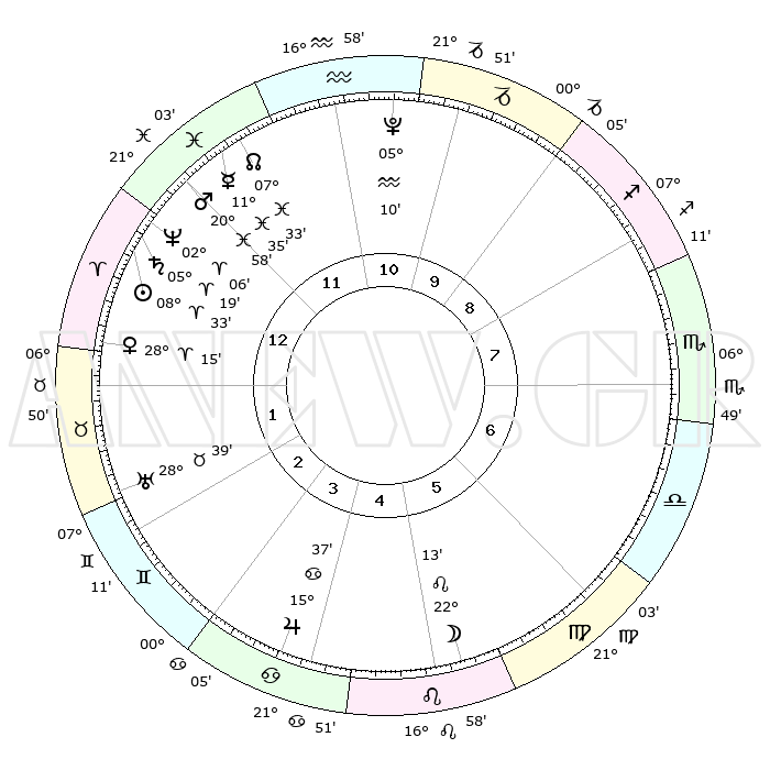 | | ΘΕΣΕΙΣ ΠΛΑΝΗΤΩΝ ΑΣΤΡΟΛΟΓΙΚΟΥ ΧΑΡΤΗ ΤΗΣ ΣΤΙΓΜΗΣ ΑΥΤΗΣ | | | | Πλανήτης | Ζώδιο | Μοίρες | Δεκαήμ. | Σε οίκο | Απόκλιση | | Ακμές των οίκων | | Ηλιος | Κριός | 08°29' | Πρώτο | 1 | 03 N 22 | | 1ος | 28°25' | Ιχθείς | | Σελήνη | Λέων | 21°19' | Τρίτο | 6 | 15 N 53 | | 2ος | 09°05' | Ταύρος | | Ερμής | Ιχθείς | 11°32' | Δεύτερο | 12 | 08 S 00 | | 3ος | 06°44' | Δίδυμοι | | Αφροδίτη | Κριός | 28°09' | Τρίτο | 1 | 10 N 18 | | 4ος | 29°07' | Δίδυμοι | | Αρης | Ιχθείς | 20°54' | Τρίτο | 12 | 04 S 34 | | 5ος | 21°21' | Καρκίνος | | Δίας | Καρκίνος | 15°36' | Δεύτερο | 4 | 22 N 53 | | 6ος | 18°31' | Λέων | | Κρόνος | Κριός | 05°19' | Πρώτο | 1 | 00 N 09 | | 7ος | 28°25' | Παρθένος | | Ουρανός | Ταύρος | 28°39' | Τρίτο | 2 | 19 N 41 | | 8ος | 09°05' | Σκορπιός | | Ποσειδώνας | Κριός | 02°06' | Πρώτο | 1 | 00 S 22 | | 9ος | 06°44' | Τοξότης | | Πλούτωνας | Υδροχόος | 05°10' | Πρώτο | 11 | 22 S 48 | | 10ος | 29°07' | Τοξότης | | Β. Δεσμός | Ιχθείς | 07°33' | Πρώτο | 12 | 08 S 44 | | 11ος | 21°21' | Αιγόκερως | | Ωροσκόπος | Ιχθείς | 28°25' | Τρίτο | | | 12ος | 18°31' | Υδροχόος | | Μεσουράνημα | Τοξότης | 29°07' | Τρίτο | | | |
