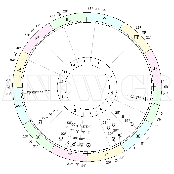 | | ΘΕΣΕΙΣ ΠΛΑΝΗΤΩΝ ΑΣΤΡΟΛΟΓΙΚΟΥ ΧΑΡΤΗ ΤΗΣ ΣΤΙΓΜΗΣ ΑΥΤΗΣ | | | | Πλανήτης | Ζώδιο | Μοίρες | Δεκαήμ. | Σε οίκο | Απόκλιση | | Ακμές των οίκων | | Ηλιος | Ταύρος | 00°50' | Πρώτο | 4 | 11 N 46 | | 1ος | 03°42' | Αιγόκερως | | Σελήνη | Δίδυμοι | 18°25' | Δεύτερο | 6 | 27 N 55 | | 2ος | 11°47' | Υδροχόος | | Ερμής | Κριός | 08°38' | Πρώτο | 3 | 01 N 02 | | 3ος | 21°60' | Ιχθείς | | Αφροδίτη | Ταύρος | 26°03' | Τρίτο | 5 | 19 N 42 | | 4ος | 25°19' | Κριός | | Αρης | Κριός | 08°38' | Πρώτο | 3 | 02 N 33 | | 5ος | 21°04' | Ταύρος | | Δίας | Καρκίνος | 17°37' | Δεύτερο | 7 | 22 N 39 | | 6ος | 12°39' | Δίδυμοι | | Κρόνος | Κριός | 08°06' | Πρώτο | 3 | 01 N 14 | | 7ος | 03°42' | Καρκίνος | | Ουρανός | Ταύρος | 29°44' | Τρίτο | 5 | 19 N 56 | | 8ος | 11°47' | Λέων | | Ποσειδώνας | Κριός | 02°56' | Πρώτο | 3 | 00 S 02 | | 9ος | 21°60' | Παρθένος | | Πλούτωνας | Υδροχόος | 05°27' | Πρώτο | 1 | 22 S 48 | | 10ος | 25°19' | Ζυγός | | Β. Δεσμός | Ιχθείς | 06°21' | Πρώτο | 2 | 09 S 11 | | 11ος | 21°04' | Σκορπιός | | Ωροσκόπος | Αιγόκερως | 03°42' | Πρώτο | | | 12ος | 12°39' | Τοξότης | | Μεσουράνημα | Ζυγός | 25°19' | Τρίτο | | | |