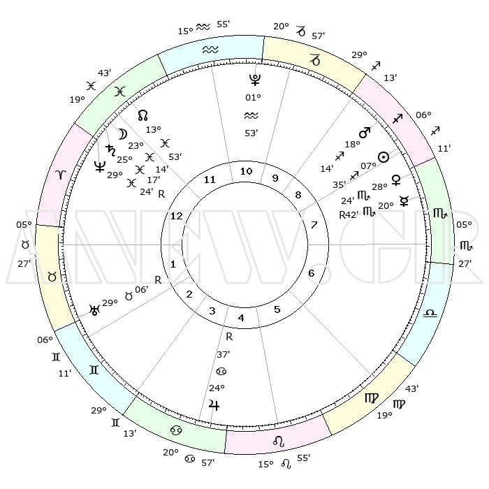 | | ΘΕΣΕΙΣ ΠΛΑΝΗΤΩΝ ΑΣΤΡΟΛΟΓΙΚΟΥ ΧΑΡΤΗ ΤΗΣ ΣΤΙΓΜΗΣ ΑΥΤΗΣ | | | | Πλανήτης | Ζώδιο | Μοίρες | Δεκαήμ. | Σε οίκο | Απόκλιση | | Ακμές των οίκων | | Ηλιος | Τοξότης | 07°33' | Πρώτο | 8 | 21 S 34 | | 1ος | 23°51' | Κριός | | Σελήνη | Ιχθείς | 22°56' | Τρίτο | 12 | 02 S 07 | | 2ος | 27°47' | Ταύρος | | Ερμής | Σκορπιός | 20°43'R | Τρίτο | 7 | 15 S 29 | | 3ος | 21°60' | Δίδυμοι | | Αφροδίτη | Σκορπιός | 28°22' | Τρίτο | 8 | 19 S 03 | | 4ος | 13°42' | Καρκίνος | | Αρης | Τοξότης | 18°13' | Δεύτερο | 8 | 23 S 34 | | 5ος | 07°32' | Λέων | | Δίας | Καρκίνος | 24°37'R | Τρίτο | 4 | 21 N 21 | | 6ος | 09°03' | Παρθένος | | Κρόνος | Ιχθείς | 25°17' | Τρίτο | 12 | 04 S 03 | | 7ος | 23°51' | Ζυγός | | Ουρανός | Ταύρος | 29°06'R | Τρίτο | 2 | 19 N 45 | | 8ος | 27°47' | Σκορπιός | | Ποσειδώνας | Ιχθείς | 29°24'R | Τρίτο | 12 | 01 S 29 | | 9ος | 21°60' | Τοξότης | | Πλούτωνας | Υδροχόος | 01°52' | Πρώτο | 10 | 23 S 24 | | 10ος | 13°42' | Αιγόκερως | | Β. Δεσμός | Ιχθείς | 13°53' | Δεύτερο | 12 | 06 S 20 | | 11ος | 07°31' | Υδροχόος | | Ωροσκόπος | Κριός | 23°51' | Τρίτο | | | 12ος | 09°03' | Ιχθείς | | Μεσουράνημα | Αιγόκερως | 13°42' | Δεύτερο | | | |