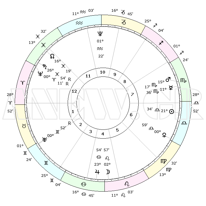 | ΘΕΣΕΙΣ ΠΛΑΝΗΤΩΝ ΑΣΤΡΟΛΟΓΙΚΟΥ ΧΑΡΤΗ ΤΗΣ ΣΤΙΓΜΗΣ ΑΥΤΗΣ | | Πλανήτης | Ζώδιο | Μοίρες | Δεκαήμ. | Σε οίκο | Απόκλιση | | Ακμές των οίκων | Ηλιος | Ζυγός | 21°24' | Τρίτο | 8 | 08 S 21 | | 1ος | 02°36' | Υδροχόος | Σελήνη | Λέων | 00°50' | Πρώτο | 6 | 23 N 42 | | 2ος | 17°06' | Ιχθείς | Ερμής | Σκορπιός | 11°23' | Δεύτερο | 9 | 16 S 50 | | 3ος | 25°08' | Κριός | Αφροδίτη | Ζυγός | 00°47' | Πρώτο | 8 | 01 N 04 | | 4ος | 23°09' | Ταύρος | Αρης | Σκορπιός | 15°10' | Δεύτερο | 9 | 16 S 35 | | 5ος | 15°44' | Δίδυμοι | Δίας | Καρκίνος | 23°53' | Τρίτο | 6 | 21 N 22 | | 6ος | 07°15' | Καρκίνος | Κρόνος | Ιχθείς | 26°55'R | Τρίτο | 2 | 03 S 31 | | 7ος | 02°36' | Λέων | Ουρανός | Δίδυμοι | 00°52'R | Πρώτο | 4 | 20 N 07 | | 8ος | 17°06' | Παρθένος | Ποσειδώνας | Κριός | 00°11'R | Πρώτο | 2 | 01 S 11 | | 9ος | 25°08' | Ζυγός | Πλούτωνας | Υδροχόος | 01°22' | Πρώτο | 12 | 23 S 32 | | 10ος | 23°09' | Σκορπιός | Β. Δεσμός | Ιχθείς | 16°20' | Δεύτερο | 1 | 05 S 24 | | 11ος | 15°44' | Τοξότης | Ωροσκόπος | Υδροχόος | 02°36' | Πρώτο | | | 12ος | 07°15' | Αιγόκερως | Μεσουράνημα | Σκορπιός | 23°09' | Τρίτο | | | |