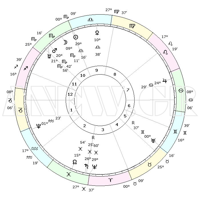 | ΘΕΣΕΙΣ ΠΛΑΝΗΤΩΝ ΑΣΤΡΟΛΟΓΙΚΟΥ ΧΑΡΤΗ ΤΗΣ ΣΤΙΓΜΗΣ ΑΥΤΗΣ | | Πλανήτης | Ζώδιο | Μοίρες | Δεκαήμ. | Σε οίκο | Απόκλιση | | Ακμές των οίκων | Ηλιος | Ζυγός | 28°54' | Τρίτο | 2 | 11 S 05 | | 1ος | 18°56' | Παρθένος | Σελήνη | Σκορπιός | 04°51' | Πρώτο | 2 | 16 S 41 | | 2ος | 14°38' | Ζυγός | Ερμής | Σκορπιός | 21°28' | Τρίτο | 3 | 20 S 27 | | 3ος | 14°36' | Σκορπιός | Αφροδίτη | Ζυγός | 10°10' | Δεύτερο | 1 | 02 S 37 | | 4ος | 17°32' | Τοξότης | Αρης | Σκορπιός | 20°27' | Τρίτο | 3 | 18 S 08 | | 5ος | 20°45' | Αιγόκερως | Δίας | Καρκίνος | 24°28' | Τρίτο | 11 | 21 N 17 | | 6ος | 21°37' | Υδροχόος | Κρόνος | Ιχθείς | 26°27'R | Τρίτο | 7 | 03 S 42 | | 7ος | 18°56' | Ιχθείς | Ουρανός | Δίδυμοι | 00°38'R | Πρώτο | 9 | 20 N 04 | | 8ος | 14°38' | Κριός | Ποσειδώνας | Κριός | 00°00'R | Πρώτο | 7 | 01 S 15 | | 9ος | 14°36' | Ταύρος | Πλούτωνας | Υδροχόος | 01°23' | Πρώτο | 5 | 23 S 32 | | 10ος | 17°32' | Δίδυμοι | Β. Δεσμός | Ιχθείς | 15°56' | Δεύτερο | 6 | 05 S 33 | | 11ος | 20°45' | Καρκίνος | Ωροσκόπος | Παρθένος | 18°56' | Δεύτερο | | | 12ος | 21°37' | Λέων | Μεσουράνημα | Δίδυμοι | 17°32' | Δεύτερο | | | |