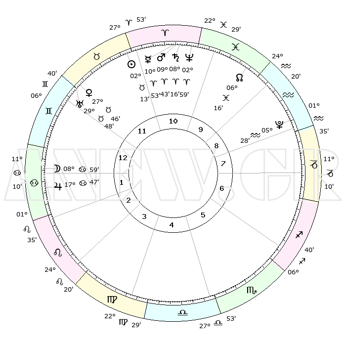 | | ΘΕΣΕΙΣ ΠΛΑΝΗΤΩΝ ΑΣΤΡΟΛΟΓΙΚΟΥ ΧΑΡΤΗ ΤΗΣ ΣΤΙΓΜΗΣ ΑΥΤΗΣ | | | | Πλανήτης | Ζώδιο | Μοίρες | Δεκαήμ. | Σε οίκο | Απόκλιση | | Ακμές των οίκων | | Ηλιος | Ταύρος | 02°09' | Πρώτο | 11 | 12 N 13 | | 1ος | 19°33' | Δίδυμοι | | Σελήνη | Καρκίνος | 08°03' | Πρώτο | 1 | 27 N 34 | | 2ος | 11°15' | Καρκίνος | | Ερμής | Κριός | 10°47' | Δεύτερο | 11 | 01 N 55 | | 3ος | 02°34' | Λέων | | Αφροδίτη | Ταύρος | 27°42' | Τρίτο | 12 | 20 N 08 | | 4ος | 27°20' | Λέων | | Αρης | Κριός | 09°40' | Πρώτο | 11 | 02 N 58 | | 5ος | 29°26' | Παρθένος | | Δίας | Καρκίνος | 17°47' | Δεύτερο | 2 | 22 N 38 | | 6ος | 09°43' | Σκορπιός | | Κρόνος | Κριός | 08°15' | Πρώτο | 11 | 01 N 17 | | 7ος | 19°33' | Τοξότης | | Ουρανός | Ταύρος | 29°48' | Τρίτο | 12 | 19 N 56 | | 8ος | 11°15' | Αιγόκερως | | Ποσειδώνας | Κριός | 02°59' | Πρώτο | 11 | 00 S 01 | | 9ος | 02°34' | Υδροχόος | | Πλούτωνας | Υδροχόος | 05°28' | Πρώτο | 9 | 22 S 48 | | 10ος | 27°20' | Υδροχόος | | Β. Δεσμός | Ιχθείς | 06°17' | Πρώτο | 10 | 09 S 12 | | 11ος | 29°26' | Ιχθείς | | Ωροσκόπος | Δίδυμοι | 19°33' | Δεύτερο | | | 12ος | 09°43' | Ταύρος | | Μεσουράνημα | Υδροχόος | 27°20' | Τρίτο | | | |
