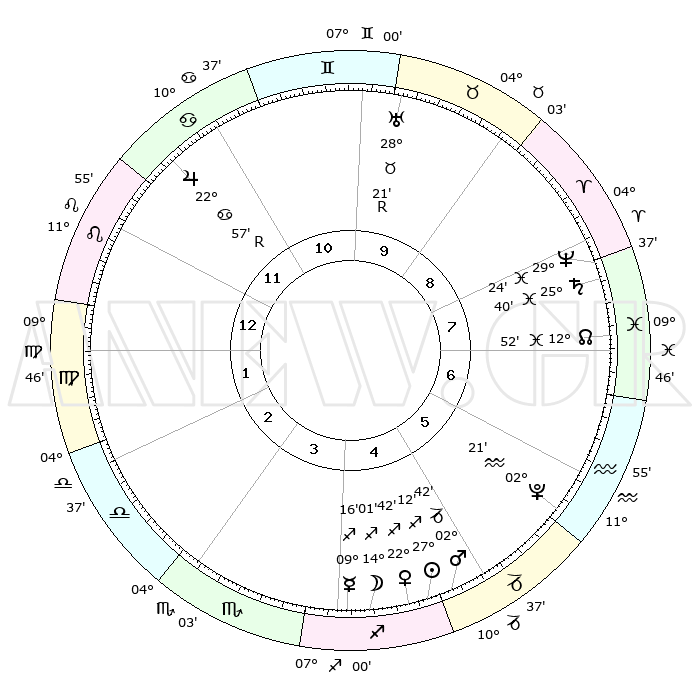| | ΘΕΣΕΙΣ ΠΛΑΝΗΤΩΝ ΑΣΤΡΟΛΟΓΙΚΟΥ ΧΑΡΤΗ ΤΗΣ ΣΤΙΓΜΗΣ ΑΥΤΗΣ | | | | Πλανήτης | Ζώδιο | Μοίρες | Δεκαήμ. | Σε οίκο | Απόκλιση | | Ακμές των οίκων | | Ηλιος | Τοξότης | 26°45' | Τρίτο | 9 | 23 S 24 | | 1ος | 26°19' | Ιχθείς | | Σελήνη | Τοξότης | 08°49' | Πρώτο | 9 | 26 S 42 | | 2ος | 07°29' | Ταύρος | | Ερμής | Τοξότης | 08°39' | Πρώτο | 9 | 20 S 39 | | 3ος | 05°28' | Δίδυμοι | | Αφροδίτη | Τοξότης | 22°09' | Τρίτο | 9 | 23 S 10 | | 4ος | 27°56' | Δίδυμοι | | Αρης | Αιγόκερως | 02°22' | Πρώτο | 10 | 24 S 13 | | 5ος | 20°05' | Καρκίνος | | Δίας | Καρκίνος | 23°00'R | Τρίτο | 5 | 21 N 40 | | 6ος | 16°56' | Λέων | | Κρόνος | Ιχθείς | 25°39' | Τρίτο | 12 | 03 S 51 | | 7ος | 26°19' | Παρθένος | | Ουρανός | Ταύρος | 28°22'R | Τρίτο | 2 | 19 N 36 | | 8ος | 07°29' | Σκορπιός | | Ποσειδώνας | Ιχθείς | 29°23' | Τρίτο | 1 | 01 S 28 | | 9ος | 05°28' | Τοξότης | | Πλούτωνας | Υδροχόος | 02°20' | Πρώτο | 11 | 23 S 18 | | 10ος | 27°56' | Τοξότης | | Β. Δεσμός | Ιχθείς | 12°53' | Δεύτερο | 12 | 06 S 43 | | 11ος | 20°05' | Αιγόκερως | | Ωροσκόπος | Ιχθείς | 26°19' | Τρίτο | | | 12ος | 16°56' | Υδροχόος | | Μεσουράνημα | Τοξότης | 27°56' | Τρίτο | | | |