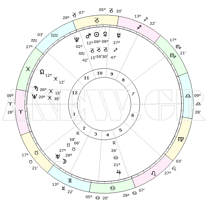 | | ΘΕΣΕΙΣ ΠΛΑΝΗΤΩΝ ΑΣΤΡΟΛΟΓΙΚΟΥ ΧΑΡΤΗ ΤΗΣ ΣΤΙΓΜΗΣ ΑΥΤΗΣ | | | | Πλανήτης | Ζώδιο | Μοίρες | Δεκαήμ. | Σε οίκο | Απόκλιση | | Ακμές των οίκων | | Ηλιος | Αιγόκερως | 09°55' | Πρώτο | 11 | 23 S 04 | | 1ος | 02°08' | Ιχθείς | | Σελήνη | Ταύρος | 27°09' | Τρίτο | 3 | 24 N 18 | | 2ος | 17°22' | Κριός | | Ερμής | Τοξότης | 27°41' | Τρίτο | 10 | 23 S 55 | | 3ος | 19°40' | Ταύρος | | Αφροδίτη | Αιγόκερως | 08°25' | Πρώτο | 11 | 23 S 39 | | 4ος | 13°51' | Δίδυμοι | | Αρης | Αιγόκερως | 12°12' | Δεύτερο | 11 | 23 S 45 | | 5ος | 05°32' | Καρκίνος | | Δίας | Καρκίνος | 21°26'R | Τρίτο | 5 | 21 N 58 | | 6ος | 29°19' | Καρκίνος | | Κρόνος | Ιχθείς | 26°15' | Τρίτο | 1 | 03 S 34 | | 7ος | 02°08' | Παρθένος | | Ουρανός | Ταύρος | 27°58'R | Τρίτο | 3 | 19 N 30 | | 8ος | 17°22' | Ζυγός | | Ποσειδώνας | Ιχθείς | 29°30' | Τρίτο | 1 | 01 S 25 | | 9ος | 19°40' | Σκορπιός | | Πλούτωνας | Υδροχόος | 02°42' | Πρώτο | 12 | 23 S 13 | | 10ος | 13°51' | Τοξότης | | Β. Δεσμός | Ιχθείς | 12°12' | Δεύτερο | 1 | 06 S 59 | | 11ος | 05°32' | Αιγόκερως | | Ωροσκόπος | Ιχθείς | 02°08' | Πρώτο | | | 12ος | 29°19' | Αιγόκερως | | Μεσουράνημα | Τοξότης | 13°51' | Δεύτερο | | | |