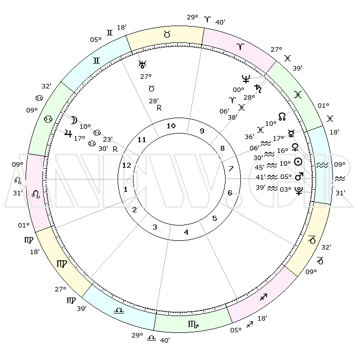 | | ΘΕΣΕΙΣ ΠΛΑΝΗΤΩΝ ΑΣΤΡΟΛΟΓΙΚΟΥ ΧΑΡΤΗ ΤΗΣ ΣΤΙΓΜΗΣ ΑΥΤΗΣ | | | | Πλανήτης | Ζώδιο | Μοίρες | Δεκαήμ. | Σε οίκο | Απόκλιση | | Ακμές των οίκων | | Ηλιος | Υδροχόος | 10°42' | Δεύτερο | 7 | 17 S 33 | | 1ος | 21°25' | Καρκίνος | | Σελήνη | Καρκίνος | 09°29' | Πρώτο | 12 | 27 N 35 | | 2ος | 12°00' | Λέων | | Ερμής | Υδροχόος | 17°00' | Δεύτερο | 8 | 17 S 36 | | 3ος | 05°55' | Παρθένος | | Αφροδίτη | Υδροχόος | 16°25' | Δεύτερο | 8 | 17 S 11 | | 4ος | 05°45' | Ζυγός | | Αρης | Υδροχόος | 05°38' | Πρώτο | 7 | 19 S 52 | | 5ος | 11°48' | Σκορπιός | | Δίας | Καρκίνος | 17°31'R | Δεύτερο | 12 | 22 N 35 | | 6ος | 18°57' | Τοξότης | | Κρόνος | Ιχθείς | 28°37' | Τρίτο | 9 | 02 S 33 | | 7ος | 21°25' | Αιγόκερως | | Ουρανός | Ταύρος | 27°28'R | Τρίτο | 11 | 19 N 24 | | 8ος | 12°00' | Υδροχόος | | Ποσειδώνας | Κριός | 00°06' | Πρώτο | 9 | 01 S 10 | | 9ος | 05°55' | Ιχθείς | | Πλούτωνας | Υδροχόος | 03°39' | Πρώτο | 7 | 23 S 02 | | 10ος | 05°45' | Κριός | | Β. Δεσμός | Ιχθείς | 10°36' | Δεύτερο | 9 | 07 S 35 | | 11ος | 11°48' | Ταύρος | | Ωροσκόπος | Καρκίνος | 21°25' | Τρίτο | | | 12ος | 18°57' | Δίδυμοι | | Μεσουράνημα | Κριός | 05°45' | Πρώτο | | | |