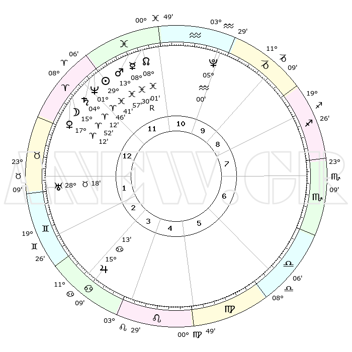 | | ΘΕΣΕΙΣ ΠΛΑΝΗΤΩΝ ΑΣΤΡΟΛΟΓΙΚΟΥ ΧΑΡΤΗ ΤΗΣ ΣΤΙΓΜΗΣ ΑΥΤΗΣ | | | | Πλανήτης | Ζώδιο | Μοίρες | Δεκαήμ. | Σε οίκο | Απόκλιση | | Ακμές των οίκων | | Ηλιος | Ιχθείς | 29°36' | Τρίτο | 12 | 00 S 09 | | 1ος | 11°44' | Κριός | | Σελήνη | Κριός | 14°44' | Δεύτερο | 1 | 08 N 38 | | 2ος | 19°00' | Ταύρος | | Ερμής | Ιχθείς | 08°31'R | Πρώτο | 12 | 07 S 20 | | 3ος | 14°44' | Δίδυμοι | | Αφροδίτη | Κριός | 17°06' | Δεύτερο | 1 | 05 N 54 | | 4ος | 06°37' | Καρκίνος | | Αρης | Ιχθείς | 13°53' | Δεύτερο | 12 | 07 S 20 | | 5ος | 29°33' | Καρκίνος | | Δίας | Καρκίνος | 15°13' | Δεύτερο | 4 | 22 N 55 | | 6ος | 28°52' | Λέων | | Κρόνος | Κριός | 04°11' | Πρώτο | 12 | 00 S 17 | | 7ος | 11°44' | Ζυγός | | Ουρανός | Ταύρος | 28°18' | Τρίτο | 2 | 19 N 36 | | 8ος | 19°00' | Σκορπιός | | Ποσειδώνας | Κριός | 01°46' | Πρώτο | 12 | 00 S 30 | | 9ος | 14°44' | Τοξότης | | Πλούτωνας | Υδροχόος | 04°60' | Πρώτο | 11 | 22 S 49 | | 10ος | 06°37' | Αιγόκερως | | Β. Δεσμός | Ιχθείς | 08°02' | Πρώτο | 12 | 08 S 33 | | 11ος | 29°33' | Αιγόκερως | | Ωροσκόπος | Κριός | 11°44' | Δεύτερο | | | 12ος | 28°52' | Υδροχόος | | Μεσουράνημα | Αιγόκερως | 06°37' | Πρώτο | | | |
