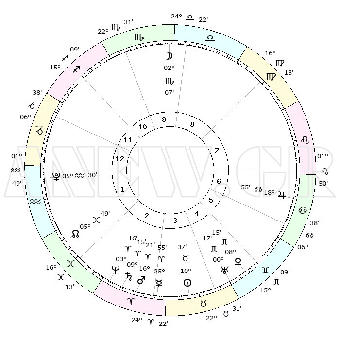 | | ΘΕΣΕΙΣ ΠΛΑΝΗΤΩΝ ΑΣΤΡΟΛΟΓΙΚΟΥ ΧΑΡΤΗ ΤΗΣ ΣΤΙΓΜΗΣ ΑΥΤΗΣ | | | | Πλανήτης | Ζώδιο | Μοίρες | Δεκαήμ. | Σε οίκο | Απόκλιση | | Ακμές των οίκων | | Ηλιος | Ταύρος | 10°32' | Δεύτερο | 4 | 14 N 59 | | 1ος | 27°59' | Τοξότης | | Σελήνη | Σκορπιός | 01°01' | Πρώτο | 10 | 15 S 39 | | 2ος | 04°38' | Υδροχόος | | Ερμής | Κριός | 25°45' | Τρίτο | 4 | 08 N 09 | | 3ος | 14°28' | Ιχθείς | | Αφροδίτη | Δίδυμοι | 08°09' | Πρώτο | 6 | 22 N 33 | | 4ος | 18°44' | Κριός | | Αρης | Κριός | 16°17' | Δεύτερο | 3 | 05 N 35 | | 5ος | 15°22' | Ταύρος | | Δίας | Καρκίνος | 18°54' | Δεύτερο | 7 | 22 N 29 | | 6ος | 07°18' | Δίδυμοι | | Κρόνος | Κριός | 09°15' | Πρώτο | 3 | 01 N 40 | | 7ος | 27°59' | Δίδυμοι | | Ουρανός | Δίδυμοι | 00°16' | Πρώτο | 5 | 20 N 02 | | 8ος | 04°38' | Λέων | | Ποσειδώνας | Κριός | 03°16' | Πρώτο | 3 | 00 N 05 | | 9ος | 14°28' | Παρθένος | | Πλούτωνας | Υδροχόος | 05°30' | Πρώτο | 2 | 22 S 49 | | 10ος | 18°43' | Ζυγός | | Β. Δεσμός | Ιχθείς | 05°49' | Πρώτο | 2 | 09 S 22 | | 11ος | 15°22' | Σκορπιός | | Ωροσκόπος | Τοξότης | 27°59' | Τρίτο | | | 12ος | 07°18' | Τοξότης | | Μεσουράνημα | Ζυγός | 18°43' | Δεύτερο | | | |