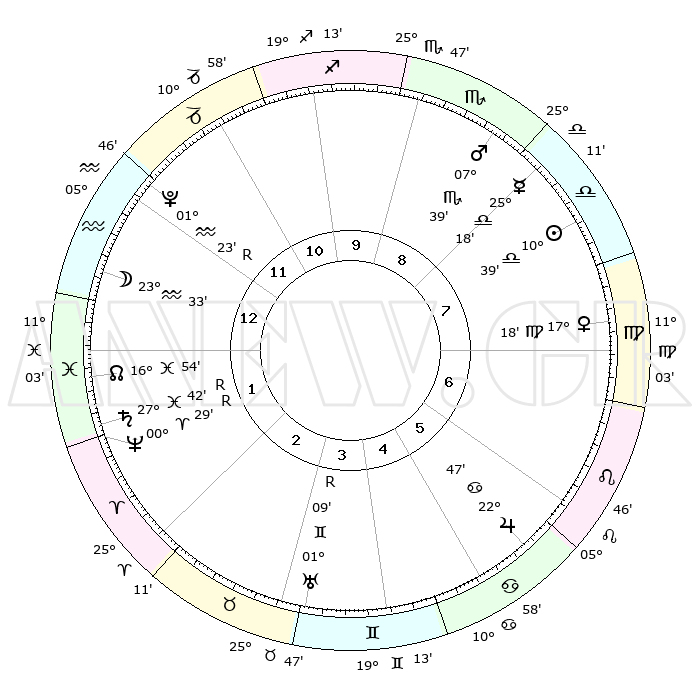 | ΘΕΣΕΙΣ ΠΛΑΝΗΤΩΝ ΑΣΤΡΟΛΟΓΙΚΟΥ ΧΑΡΤΗ ΤΗΣ ΣΤΙΓΜΗΣ ΑΥΤΗΣ | | Πλανήτης | Ζώδιο | Μοίρες | Δεκαήμ. | Σε οίκο | Απόκλιση | | Ακμές των οίκων | Ηλιος | Ζυγός | 10°35' | Δεύτερο | 8 | 04 S 11 | | 1ος | 08°25' | Υδροχόος | Σελήνη | Υδροχόος | 22°42' | Τρίτο | 1 | 16 S 05 | | 2ος | 23°39' | Ιχθείς | Ερμής | Ζυγός | 25°12' | Τρίτο | 8 | 10 S 08 | | 3ος | 00°38' | Ταύρος | Αφροδίτη | Παρθένος | 17°14' | Δεύτερο | 7 | 06 N 17 | | 4ος | 27°44' | Ταύρος | Αρης | Σκορπιός | 07°37' | Πρώτο | 9 | 14 S 09 | | 5ος | 19°58' | Δίδυμοι | Δίας | Καρκίνος | 22°46' | Τρίτο | 6 | 21 N 32 | | 6ος | 11°47' | Καρκίνος | Κρόνος | Ιχθείς | 27°42'R | Τρίτο | 2 | 03 S 13 | | 7ος | 08°25' | Λέων | Ουρανός | Δίδυμοι | 01°09'R | Πρώτο | 4 | 20 N 11 | | 8ος | 23°39' | Παρθένος | Ποσειδώνας | Κριός | 00°29'R | Πρώτο | 2 | 01 S 04 | | 9ος | 00°38' | Σκορπιός | Πλούτωνας | Υδροχόος | 01°23'R | Πρώτο | 12 | 23 S 32 | | 10ος | 27°44' | Σκορπιός | Β. Δεσμός | Ιχθείς | 16°54' | Δεύτερο | 1 | 05 S 10 | | 11ος | 19°58' | Τοξότης | Ωροσκόπος | Υδροχόος | 08°25' | Πρώτο | | | 12ος | 11°47' | Αιγόκερως | Μεσουράνημα | Σκορπιός | 27°44' | Τρίτο | | | |