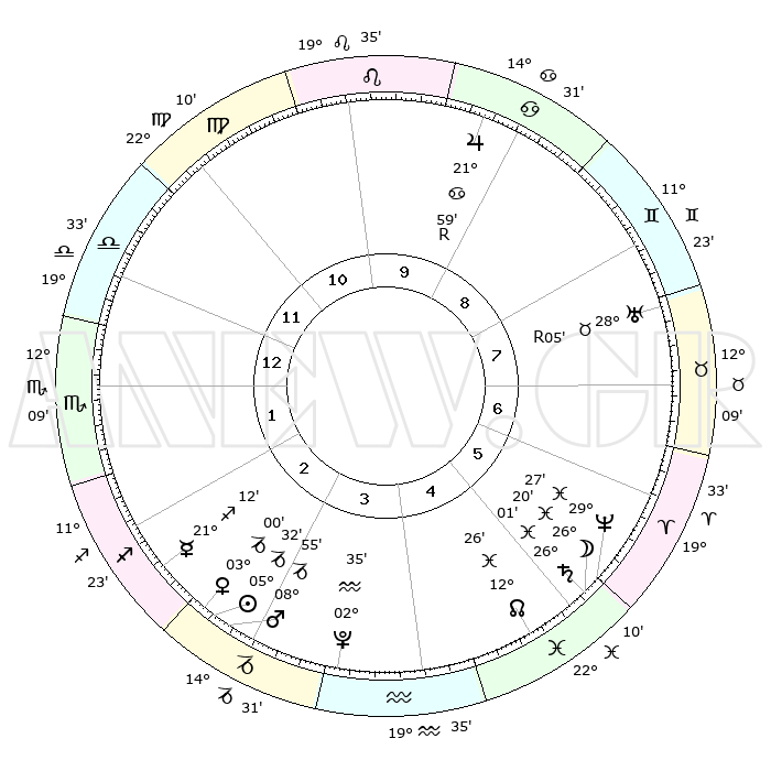 | | ΘΕΣΕΙΣ ΠΛΑΝΗΤΩΝ ΑΣΤΡΟΛΟΓΙΚΟΥ ΧΑΡΤΗ ΤΗΣ ΣΤΙΓΜΗΣ ΑΥΤΗΣ | | | | Πλανήτης | Ζώδιο | Μοίρες | Δεκαήμ. | Σε οίκο | Απόκλιση | | Ακμές των οίκων | | Ηλιος | Αιγόκερως | 05°27' | Πρώτο | 3 | 23 S 19 | | 1ος | 18°17' | Ζυγός | | Σελήνη | Ιχθείς | 25°15' | Τρίτο | 6 | 00 S 46 | | 2ος | 16°02' | Σκορπιός | | Ερμής | Τοξότης | 21°05' | Τρίτο | 3 | 23 S 07 | | 3ος | 17°14' | Τοξότης | | Αφροδίτη | Αιγόκερως | 02°54' | Πρώτο | 3 | 23 S 43 | | 4ος | 20°44' | Αιγόκερως | | Αρης | Αιγόκερως | 08°52' | Πρώτο | 3 | 24 S 00 | | 5ος | 23°41' | Υδροχόος | | Δίας | Καρκίνος | 21°60'R | Τρίτο | 10 | 21 N 52 | | 6ος | 23°15' | Ιχθείς | | Κρόνος | Ιχθείς | 26°01' | Τρίτο | 6 | 03 S 40 | | 7ος | 18°17' | Κριός | | Ουρανός | Ταύρος | 28°05'R | Τρίτο | 8 | 19 N 32 | | 8ος | 16°02' | Ταύρος | | Ποσειδώνας | Ιχθείς | 29°27' | Τρίτο | 6 | 01 S 27 | | 9ος | 17°14' | Δίδυμοι | | Πλούτωνας | Υδροχόος | 02°34' | Πρώτο | 4 | 23 S 15 | | 10ος | 20°44' | Καρκίνος | | Β. Δεσμός | Ιχθείς | 12°26' | Δεύτερο | 5 | 06 S 54 | | 11ος | 23°41' | Λέων | | Ωροσκόπος | Ζυγός | 18°17' | Δεύτερο | | | 12ος | 23°15' | Παρθένος | | Μεσουράνημα | Καρκίνος | 20°44' | Τρίτο | | | |