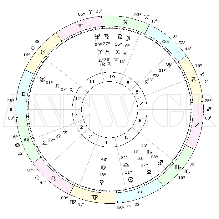 | ΘΕΣΕΙΣ ΠΛΑΝΗΤΩΝ ΑΣΤΡΟΛΟΓΙΚΟΥ ΧΑΡΤΗ ΤΗΣ ΣΤΙΓΜΗΣ ΑΥΤΗΣ | | Πλανήτης | Ζώδιο | Μοίρες | Δεκαήμ. | Σε οίκο | Απόκλιση | | Ακμές των οίκων | Ηλιος | Ζυγός | 11°43' | Δεύτερο | 6 | 04 S 38 | | 1ος | 02°06' | Ταύρος | Σελήνη | Ιχθείς | 08°31' | Πρώτο | 11 | 09 S 12 | | 2ος | 03°44' | Δίδυμοι | Ερμής | Ζυγός | 26°59' | Τρίτο | 6 | 10 S 54 | | 3ος | 27°05' | Δίδυμοι | Αφροδίτη | Παρθένος | 18°39' | Δεύτερο | 6 | 05 N 45 | | 4ος | 18°47' | Καρκίνος | Αρης | Σκορπιός | 08°24' | Πρώτο | 7 | 14 S 25 | | 5ος | 13°24' | Λέων | Δίας | Καρκίνος | 22°54' | Τρίτο | 4 | 21 N 31 | | 6ος | 16°32' | Παρθένος | Κρόνος | Ιχθείς | 27°37'R | Τρίτο | 12 | 03 S 15 | | 7ος | 02°06' | Σκορπιός | Ουρανός | Δίδυμοι | 01°08'R | Πρώτο | 1 | 20 N 10 | | 8ος | 03°44' | Τοξότης | Ποσειδώνας | Κριός | 00°27'R | Πρώτο | 12 | 01 S 05 | | 9ος | 27°05' | Τοξότης | Πλούτωνας | Υδροχόος | 01°23'R | Πρώτο | 10 | 23 S 32 | | 10ος | 18°47' | Αιγόκερως | Β. Δεσμός | Ιχθείς | 16°51' | Δεύτερο | 12 | 05 S 12 | | 11ος | 13°24' | Υδροχόος | Ωροσκόπος | Ταύρος | 02°06' | Πρώτο | | | 12ος | 16°32' | Ιχθείς | Μεσουράνημα | Αιγόκερως | 18°47' | Δεύτερο | | | |