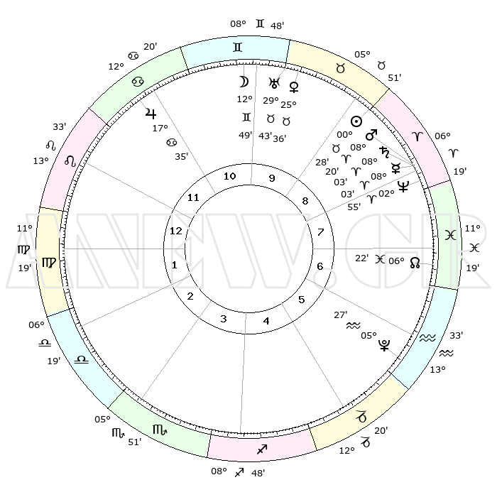 | | ΘΕΣΕΙΣ ΠΛΑΝΗΤΩΝ ΑΣΤΡΟΛΟΓΙΚΟΥ ΧΑΡΤΗ ΤΗΣ ΣΤΙΓΜΗΣ ΑΥΤΗΣ | | | | Πλανήτης | Ζώδιο | Μοίρες | Δεκαήμ. | Σε οίκο | Απόκλιση | | Ακμές των οίκων | | Ηλιος | Ταύρος | 00°25' | Πρώτο | 9 | 11 N 37 | | 1ος | 25°31' | Λέων | | Σελήνη | Δίδυμοι | 12°01' | Δεύτερο | 10 | 27 N 16 | | 2ος | 18°54' | Παρθένος | | Ερμής | Κριός | 07°58' | Πρώτο | 8 | 00 N 45 | | 3ος | 17°08' | Ζυγός | | Αφροδίτη | Ταύρος | 25°32' | Τρίτο | 10 | 19 N 33 | | 4ος | 19°59' | Σκορπιός | | Αρης | Κριός | 08°17' | Πρώτο | 8 | 02 N 25 | | 5ος | 24°29' | Τοξότης | | Δίας | Καρκίνος | 17°34' | Δεύτερο | 11 | 22 N 40 | | 6ος | 26°49' | Αιγόκερως | | Κρόνος | Κριός | 08°03' | Πρώτο | 8 | 01 N 13 | | 7ος | 25°31' | Υδροχόος | | Ουρανός | Ταύρος | 29°42' | Τρίτο | 10 | 19 N 55 | | 8ος | 18°54' | Ιχθείς | | Ποσειδώνας | Κριός | 02°55' | Πρώτο | 8 | 00 S 03 | | 9ος | 17°08' | Κριός | | Πλούτωνας | Υδροχόος | 05°27' | Πρώτο | 6 | 22 S 48 | | 10ος | 19°59' | Ταύρος | | Β. Δεσμός | Ιχθείς | 06°22' | Πρώτο | 7 | 09 S 10 | | 11ος | 24°29' | Δίδυμοι | | Ωροσκόπος | Λέων | 25°31' | Τρίτο | | | 12ος | 26°50' | Καρκίνος | | Μεσουράνημα | Ταύρος | 19°59' | Δεύτερο | | | |