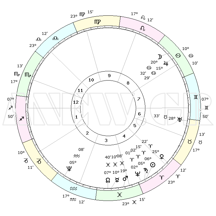 | | ΘΕΣΕΙΣ ΠΛΑΝΗΤΩΝ ΑΣΤΡΟΛΟΓΙΚΟΥ ΧΑΡΤΗ ΤΗΣ ΣΤΙΓΜΗΣ ΑΥΤΗΣ | | | | Πλανήτης | Ζώδιο | Μοίρες | Δεκαήμ. | Σε οίκο | Απόκλιση | | Ακμές των οίκων | | Ηλιος | Κριός | 06°11' | Πρώτο | 5 | 02 N 27 | | 1ος | 19°09' | Σκορπιός | | Σελήνη | Καρκίνος | 19°39' | Δεύτερο | 8 | 25 N 54 | | 2ος | 19°00' | Τοξότης | | Ερμής | Ιχθείς | 10°08' | Δεύτερο | 4 | 08 S 07 | | 3ος | 23°03' | Αιγόκερως | | Αφροδίτη | Κριός | 25°17' | Τρίτο | 5 | 09 N 11 | | 4ος | 28°36' | Υδροχόος | | Αρης | Ιχθείς | 19°05' | Δεύτερο | 4 | 05 S 18 | | 5ος | 00°44' | Κριός | | Δίας | Καρκίνος | 15°29' | Δεύτερο | 8 | 22 N 54 | | 6ος | 27°14' | Κριός | | Κρόνος | Κριός | 05°01' | Πρώτο | 5 | 00 N 02 | | 7ος | 19°09' | Ταύρος | | Ουρανός | Ταύρος | 28°33' | Τρίτο | 7 | 19 N 40 | | 8ος | 19°00' | Δίδυμοι | | Ποσειδώνας | Κριός | 02°01' | Πρώτο | 5 | 00 S 24 | | 9ος | 23°03' | Καρκίνος | | Πλούτωνας | Υδροχόος | 05°08' | Πρώτο | 3 | 22 S 48 | | 10ος | 28°36' | Λέων | | Β. Δεσμός | Ιχθείς | 07°41' | Πρώτο | 4 | 08 S 41 | | 11ος | 00°44' | Ζυγός | | Ωροσκόπος | Σκορπιός | 19°09' | Δεύτερο | | | 12ος | 27°14' | Ζυγός | | Μεσουράνημα | Λέων | 28°36' | Τρίτο | | | |
