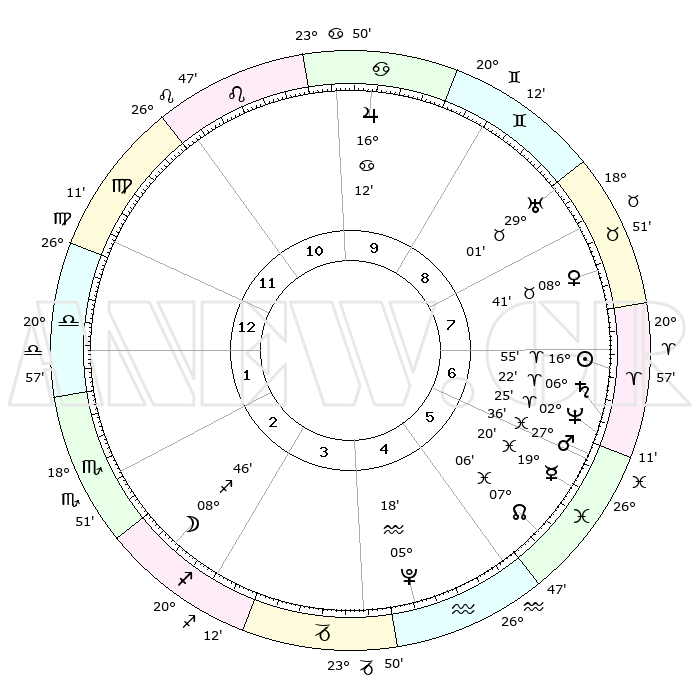 | | ΘΕΣΕΙΣ ΠΛΑΝΗΤΩΝ ΑΣΤΡΟΛΟΓΙΚΟΥ ΧΑΡΤΗ ΤΗΣ ΣΤΙΓΜΗΣ ΑΥΤΗΣ | | | | Πλανήτης | Ζώδιο | Μοίρες | Δεκαήμ. | Σε οίκο | Απόκλιση | | Ακμές των οίκων | | Ηλιος | Κριός | 16°51' | Δεύτερο | 7 | 06 N 37 | | 1ος | 03°48' | Ζυγός | | Σελήνη | Τοξότης | 08°04' | Πρώτο | 3 | 26 S 45 | | 2ος | 00°39' | Σκορπιός | | Ερμής | Ιχθείς | 19°16' | Δεύτερο | 6 | 06 S 07 | | 3ος | 01°14' | Τοξότης | | Αφροδίτη | Ταύρος | 08°36' | Πρώτο | 8 | 14 N 11 | | 4ος | 04°16' | Αιγόκερως | | Αρης | Ιχθείς | 27°33' | Τρίτο | 6 | 01 S 55 | | 5ος | 07°13' | Υδροχόος | | Δίας | Καρκίνος | 16°12' | Δεύτερο | 10 | 22 N 49 | | 6ος | 07°30' | Ιχθείς | | Κρόνος | Κριός | 06°22' | Πρώτο | 7 | 00 N 34 | | 7ος | 03°48' | Κριός | | Ουρανός | Ταύρος | 29°01' | Τρίτο | 8 | 19 N 46 | | 8ος | 00°39' | Ταύρος | | Ποσειδώνας | Κριός | 02°25' | Πρώτο | 6 | 00 S 14 | | 9ος | 01°14' | Δίδυμοι | | Πλούτωνας | Υδροχόος | 05°18' | Πρώτο | 4 | 22 S 47 | | 10ος | 04°16' | Καρκίνος | | Β. Δεσμός | Ιχθείς | 07°06' | Πρώτο | 5 | 08 S 54 | | 11ος | 07°13' | Λέων | | Ωροσκόπος | Ζυγός | 03°48' | Πρώτο | | | 12ος | 07°30' | Παρθένος | | Μεσουράνημα | Καρκίνος | 04°16' | Πρώτο | | | |