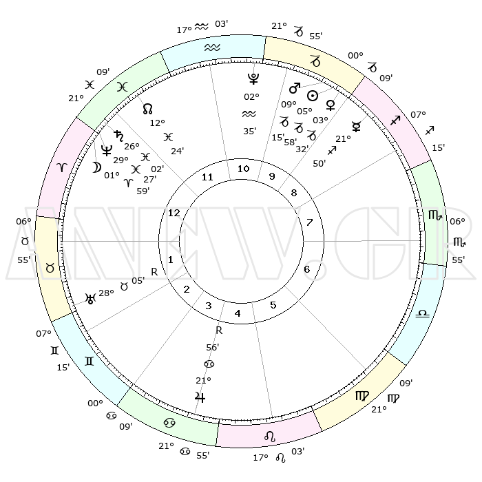 | | ΘΕΣΕΙΣ ΠΛΑΝΗΤΩΝ ΑΣΤΡΟΛΟΓΙΚΟΥ ΧΑΡΤΗ ΤΗΣ ΣΤΙΓΜΗΣ ΑΥΤΗΣ | | | | Πλανήτης | Ζώδιο | Μοίρες | Δεκαήμ. | Σε οίκο | Απόκλιση | | Ακμές των οίκων | | Ηλιος | Αιγόκερως | 05°54' | Πρώτο | 10 | 23 S 18 | | 1ος | 26°54' | Ιχθείς | | Σελήνη | Κριός | 01°02' | Πρώτο | 1 | 01 N 59 | | 2ος | 07°55' | Ταύρος | | Ερμής | Τοξότης | 21°44' | Τρίτο | 9 | 23 S 13 | | 3ος | 05°48' | Δίδυμοι | | Αφροδίτη | Αιγόκερως | 03°27' | Πρώτο | 10 | 23 S 43 | | 4ος | 28°15' | Δίδυμοι | | Αρης | Αιγόκερως | 09°11' | Πρώτο | 10 | 23 S 58 | | 5ος | 20°26' | Καρκίνος | | Δίας | Καρκίνος | 21°56'R | Τρίτο | 5 | 21 N 52 | | 6ος | 17°22' | Λέων | | Κρόνος | Ιχθείς | 26°02' | Τρίτο | 12 | 03 S 40 | | 7ος | 26°54' | Παρθένος | | Ουρανός | Ταύρος | 28°05'R | Τρίτο | 2 | 19 N 32 | | 8ος | 07°55' | Σκορπιός | | Ποσειδώνας | Ιχθείς | 29°27' | Τρίτο | 1 | 01 S 26 | | 9ος | 05°48' | Τοξότης | | Πλούτωνας | Υδροχόος | 02°35' | Πρώτο | 11 | 23 S 15 | | 10ος | 28°15' | Τοξότης | | Β. Δεσμός | Ιχθείς | 12°25' | Δεύτερο | 12 | 06 S 54 | | 11ος | 20°26' | Αιγόκερως | | Ωροσκόπος | Ιχθείς | 26°54' | Τρίτο | | | 12ος | 17°22' | Υδροχόος | | Μεσουράνημα | Τοξότης | 28°15' | Τρίτο | | | |