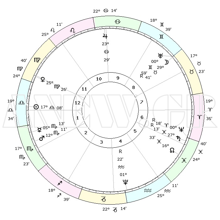 | ΘΕΣΕΙΣ ΠΛΑΝΗΤΩΝ ΑΣΤΡΟΛΟΓΙΚΟΥ ΧΑΡΤΗ ΤΗΣ ΣΤΙΓΜΗΣ ΑΥΤΗΣ | | Πλανήτης | Ζώδιο | Μοίρες | Δεκαήμ. | Σε οίκο | Απόκλιση | | Ακμές των οίκων | Ηλιος | Ζυγός | 16°49' | Δεύτερο | 4 | 06 S 36 | | 1ος | 10°35' | Καρκίνος | Σελήνη | Ταύρος | 24°40' | Τρίτο | 11 | 23 N 34 | | 2ος | 01°00' | Λέων | Ερμής | Σκορπιός | 04°43' | Πρώτο | 5 | 14 S 11 | | 3ος | 23°41' | Λέων | Αφροδίτη | Παρθένος | 25°01' | Τρίτο | 4 | 03 N 19 | | 4ος | 21°45' | Παρθένος | Αρης | Σκορπιός | 11°57' | Δεύτερο | 5 | 15 S 35 | | 5ος | 27°05' | Ζυγός | Δίας | Καρκίνος | 23°27' | Τρίτο | 1 | 21 N 26 | | 6ος | 05°57' | Τοξότης | Κρόνος | Ιχθείς | 27°14'R | Τρίτο | 10 | 03 S 24 | | 7ος | 10°35' | Αιγόκερως | Ουρανός | Δίδυμοι | 00°60'R | Πρώτο | 11 | 20 N 09 | | 8ος | 01°00' | Υδροχόος | Ποσειδώνας | Κριός | 00°18'R | Πρώτο | 10 | 01 S 08 | | 9ος | 23°41' | Υδροχόος | Πλούτωνας | Υδροχόος | 01°22'R | Πρώτο | 8 | 23 S 32 | | 10ος | 21°45' | Ιχθείς | Β. Δεσμός | Ιχθείς | 16°34' | Δεύτερο | 9 | 05 S 18 | | 11ος | 27°05' | Κριός | Ωροσκόπος | Καρκίνος | 10°35' | Δεύτερο | | | 12ος | 05°57' | Δίδυμοι | Μεσουράνημα | Ιχθείς | 21°45' | Τρίτο | | | |