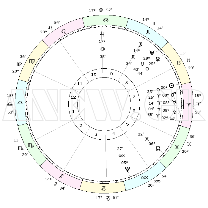 | | ΘΕΣΕΙΣ ΠΛΑΝΗΤΩΝ ΑΣΤΡΟΛΟΓΙΚΟΥ ΧΑΡΤΗ ΤΗΣ ΣΤΙΓΜΗΣ ΑΥΤΗΣ | | | | Πλανήτης | Ζώδιο | Μοίρες | Δεκαήμ. | Σε οίκο | Απόκλιση | | Ακμές των οίκων | | Ηλιος | Ταύρος | 00°32' | Πρώτο | 8 | 11 N 39 | | 1ος | 29°55' | Παρθένος | | Σελήνη | Δίδυμοι | 13°46' | Δεύτερο | 9 | 27 N 29 | | 2ος | 26°30' | Ζυγός | | Ερμής | Κριός | 08°09' | Πρώτο | 7 | 00 N 50 | | 3ος | 26°56' | Σκορπιός | | Αφροδίτη | Ταύρος | 25°40' | Τρίτο | 8 | 19 N 35 | | 4ος | 29°55' | Τοξότης | | Αρης | Κριός | 08°23' | Πρώτο | 7 | 02 N 27 | | 5ος | 02°53' | Υδροχόος | | Δίας | Καρκίνος | 17°35' | Δεύτερο | 10 | 22 N 39 | | 6ος | 03°20' | Ιχθείς | | Κρόνος | Κριός | 08°03' | Πρώτο | 7 | 01 N 13 | | 7ος | 29°55' | Ιχθείς | | Ουρανός | Ταύρος | 29°43' | Τρίτο | 9 | 19 N 55 | | 8ος | 26°30' | Κριός | | Ποσειδώνας | Κριός | 02°55' | Πρώτο | 7 | 00 S 03 | | 9ος | 26°56' | Ταύρος | | Πλούτωνας | Υδροχόος | 05°27' | Πρώτο | 5 | 22 S 48 | | 10ος | 29°55' | Δίδυμοι | | Β. Δεσμός | Ιχθείς | 06°22' | Πρώτο | 6 | 09 S 10 | | 11ος | 02°53' | Λέων | | Ωροσκόπος | Παρθένος | 29°55' | Τρίτο | | | 12ος | 03°20' | Παρθένος | | Μεσουράνημα | Δίδυμοι | 29°55' | Τρίτο | | | |