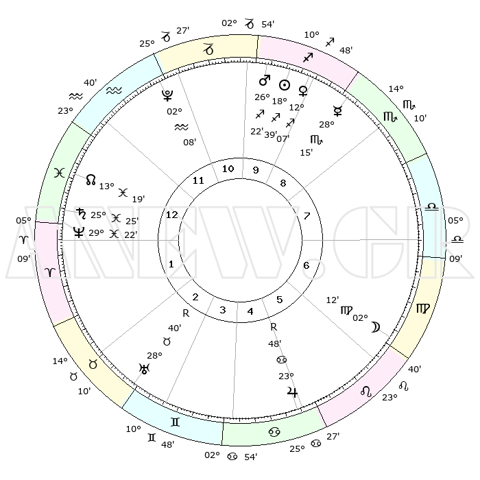 | | ΘΕΣΕΙΣ ΠΛΑΝΗΤΩΝ ΑΣΤΡΟΛΟΓΙΚΟΥ ΧΑΡΤΗ ΤΗΣ ΣΤΙΓΜΗΣ ΑΥΤΗΣ | | | | Πλανήτης | Ζώδιο | Μοίρες | Δεκαήμ. | Σε οίκο | Απόκλιση | | Ακμές των οίκων | | Ηλιος | Τοξότης | 18°37' | Δεύτερο | 9 | 22 S 57 | | 1ος | 14°23' | Ιχθείς | | Σελήνη | Παρθένος | 01°45' | Πρώτο | 6 | 11 N 47 | | 2ος | 27°58' | Κριός | | Ερμής | Σκορπιός | 28°12' | Τρίτο | 9 | 17 S 44 | | 3ος | 27°58' | Ταύρος | | Αφροδίτη | Τοξότης | 12°05' | Δεύτερο | 9 | 21 S 53 | | 4ος | 21°09' | Δίδυμοι | | Αρης | Τοξότης | 26°21' | Τρίτο | 10 | 24 S 07 | | 5ος | 12°57' | Καρκίνος | | Δίας | Καρκίνος | 23°48'R | Τρίτο | 5 | 21 N 31 | | 6ος | 08°10' | Λέων | | Κρόνος | Ιχθείς | 25°25' | Τρίτο | 1 | 03 S 58 | | 7ος | 14°23' | Παρθένος | | Ουρανός | Ταύρος | 28°40'R | Τρίτο | 3 | 19 N 40 | | 8ος | 27°58' | Ζυγός | | Ποσειδώνας | Ιχθείς | 29°22'R | Τρίτο | 1 | 01 S 29 | | 9ος | 27°58' | Σκορπιός | | Πλούτωνας | Υδροχόος | 02°08' | Πρώτο | 11 | 23 S 21 | | 10ος | 21°09' | Τοξότης | | Β. Δεσμός | Ιχθείς | 13°19' | Δεύτερο | 12 | 06 S 33 | | 11ος | 12°57' | Αιγόκερως | | Ωροσκόπος | Ιχθείς | 14°23' | Δεύτερο | | | 12ος | 08°10' | Υδροχόος | | Μεσουράνημα | Τοξότης | 21°09' | Τρίτο | | | |