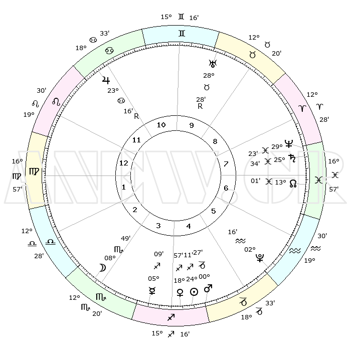 | | ΘΕΣΕΙΣ ΠΛΑΝΗΤΩΝ ΑΣΤΡΟΛΟΓΙΚΟΥ ΧΑΡΤΗ ΤΗΣ ΣΤΙΓΜΗΣ ΑΥΤΗΣ | | | | Πλανήτης | Ζώδιο | Μοίρες | Δεκαήμ. | Σε οίκο | Απόκλιση | | Ακμές των οίκων | | Ηλιος | Τοξότης | 24°00' | Τρίτο | 5 | 23 S 18 | | 1ος | 27°24' | Καρκίνος | | Σελήνη | Σκορπιός | 06°48' | Πρώτο | 4 | 17 S 36 | | 2ος | 18°17' | Λέων | | Ερμής | Τοξότης | 04°55' | Πρώτο | 5 | 19 S 41 | | 3ος | 12°59' | Παρθένος | | Αφροδίτη | Τοξότης | 18°45' | Δεύτερο | 5 | 22 S 49 | | 4ος | 13°41' | Ζυγός | | Αρης | Αιγόκερως | 00°19' | Πρώτο | 6 | 24 S 13 | | 5ος | 19°46' | Σκορπιός | | Δίας | Καρκίνος | 23°17'R | Τρίτο | 12 | 21 N 37 | | 6ος | 25°54' | Τοξότης | | Κρόνος | Ιχθείς | 25°33' | Τρίτο | 9 | 03 S 54 | | 7ος | 27°24' | Αιγόκερως | | Ουρανός | Ταύρος | 28°28'R | Τρίτο | 11 | 19 N 37 | | 8ος | 18°17' | Υδροχόος | | Ποσειδώνας | Ιχθείς | 29°23' | Τρίτο | 9 | 01 S 29 | | 9ος | 12°59' | Ιχθείς | | Πλούτωνας | Υδροχόος | 02°16' | Πρώτο | 7 | 23 S 19 | | 10ος | 13°41' | Κριός | | Β. Δεσμός | Ιχθείς | 13°02' | Δεύτερο | 9 | 06 S 40 | | 11ος | 19°46' | Ταύρος | | Ωροσκόπος | Καρκίνος | 27°24' | Τρίτο | | | 12ος | 25°54' | Δίδυμοι | | Μεσουράνημα | Κριός | 13°41' | Δεύτερο | | | |