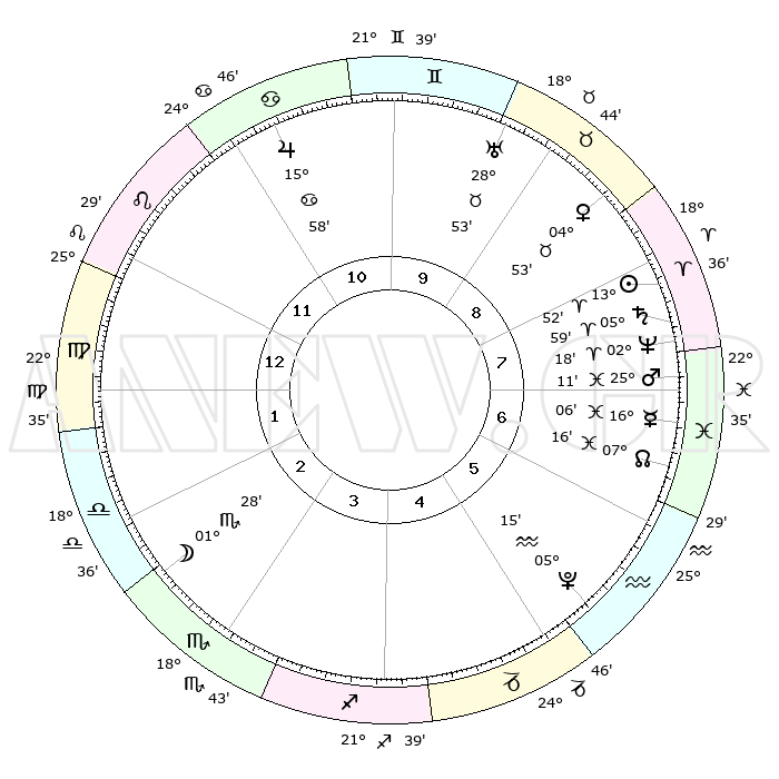 | | ΘΕΣΕΙΣ ΠΛΑΝΗΤΩΝ ΑΣΤΡΟΛΟΓΙΚΟΥ ΧΑΡΤΗ ΤΗΣ ΣΤΙΓΜΗΣ ΑΥΤΗΣ | | | | Πλανήτης | Ζώδιο | Μοίρες | Δεκαήμ. | Σε οίκο | Απόκλιση | | Ακμές των οίκων | | Ηλιος | Κριός | 13°49' | Δεύτερο | 8 | 05 N 27 | | 1ος | 03°50' | Παρθένος | | Σελήνη | Σκορπιός | 00°41' | Πρώτο | 3 | 15 S 32 | | 2ος | 28°05' | Παρθένος | | Ερμής | Ιχθείς | 16°02' | Δεύτερο | 7 | 07 S 03 | | 3ος | 27°05' | Ζυγός | | Αφροδίτη | Ταύρος | 04°48' | Πρώτο | 9 | 12 N 48 | | 4ος | 00°02' | Τοξότης | | Αρης | Ιχθείς | 25°08' | Τρίτο | 7 | 02 S 53 | | 5ος | 03°59' | Αιγόκερως | | Δίας | Καρκίνος | 15°57' | Δεύτερο | 11 | 22 N 51 | | 6ος | 05°39' | Υδροχόος | | Κρόνος | Κριός | 05°59' | Πρώτο | 8 | 00 N 25 | | 7ος | 03°50' | Ιχθείς | | Ουρανός | Ταύρος | 28°53' | Τρίτο | 9 | 19 N 44 | | 8ος | 28°05' | Ιχθείς | | Ποσειδώνας | Κριός | 02°18' | Πρώτο | 8 | 00 S 17 | | 9ος | 27°05' | Κριός | | Πλούτωνας | Υδροχόος | 05°15' | Πρώτο | 5 | 22 S 47 | | 10ος | 00°02' | Δίδυμοι | | Β. Δεσμός | Ιχθείς | 07°16' | Πρώτο | 7 | 08 S 50 | | 11ος | 03°58' | Καρκίνος | | Ωροσκόπος | Παρθένος | 03°50' | Πρώτο | | | 12ος | 05°39' | Λέων | | Μεσουράνημα | Δίδυμοι | 00°02' | Πρώτο | | | |