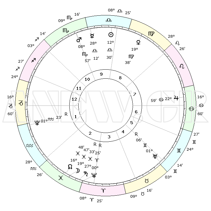 | ΘΕΣΕΙΣ ΠΛΑΝΗΤΩΝ ΑΣΤΡΟΛΟΓΙΚΟΥ ΧΑΡΤΗ ΤΗΣ ΣΤΙΓΜΗΣ ΑΥΤΗΣ | | Πλανήτης | Ζώδιο | Μοίρες | Δεκαήμ. | Σε οίκο | Απόκλιση | | Ακμές των οίκων | Ηλιος | Ζυγός | 12°24' | Δεύτερο | 10 | 04 S 54 | | 1ος | 11°45' | Τοξότης | Σελήνη | Ιχθείς | 18°16' | Δεύτερο | 3 | 04 S 38 | | 2ος | 14°47' | Αιγόκερως | Ερμής | Ζυγός | 28°02' | Τρίτο | 11 | 11 S 22 | | 3ος | 22°28' | Υδροχόος | Αφροδίτη | Παρθένος | 19°30' | Δεύτερο | 9 | 05 N 26 | | 4ος | 28°23' | Ιχθείς | Αρης | Σκορπιός | 08°52' | Πρώτο | 11 | 14 S 34 | | 5ος | 27°43' | Κριός | Δίας | Καρκίνος | 22°59' | Τρίτο | 8 | 21 N 30 | | 6ος | 21°15' | Ταύρος | Κρόνος | Ιχθείς | 27°34'R | Τρίτο | 3 | 03 S 16 | | 7ος | 11°45' | Δίδυμοι | Ουρανός | Δίδυμοι | 01°07'R | Πρώτο | 6 | 20 N 10 | | 8ος | 14°47' | Καρκίνος | Ποσειδώνας | Κριός | 00°26'R | Πρώτο | 4 | 01 S 05 | | 9ος | 22°28' | Λέων | Πλούτωνας | Υδροχόος | 01°23'R | Πρώτο | 2 | 23 S 32 | | 10ος | 28°23' | Παρθένος | Β. Δεσμός | Ιχθείς | 16°48' | Δεύτερο | 3 | 05 S 12 | | 11ος | 27°43' | Ζυγός | Ωροσκόπος | Τοξότης | 11°45' | Δεύτερο | | | 12ος | 21°15' | Σκορπιός | Μεσουράνημα | Παρθένος | 28°23' | Τρίτο | | | |