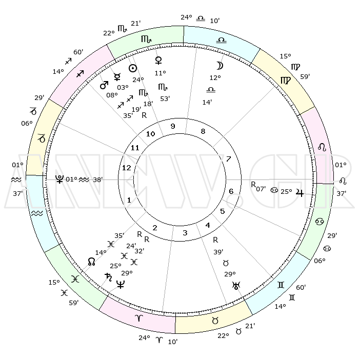 | | ΘΕΣΕΙΣ ΠΛΑΝΗΤΩΝ ΑΣΤΡΟΛΟΓΙΚΟΥ ΧΑΡΤΗ ΤΗΣ ΣΤΙΓΜΗΣ ΑΥΤΗΣ | | | | Πλανήτης | Ζώδιο | Μοίρες | Δεκαήμ. | Σε οίκο | Απόκλιση | | Ακμές των οίκων | | Ηλιος | Σκορπιός | 24°14' | Τρίτο | 11 | 18 S 49 | | 1ος | 04°48' | Αιγόκερως | | Σελήνη | Ζυγός | 11°23' | Δεύτερο | 9 | 06 S 29 | | 2ος | 13°10' | Υδροχόος | | Ερμής | Τοξότης | 03°23'R | Πρώτο | 11 | 21 S 38 | | 3ος | 23°25' | Ιχθείς | | Αφροδίτη | Σκορπιός | 11°48' | Δεύτερο | 10 | 14 S 15 | | 4ος | 26°33' | Κριός | | Αρης | Τοξότης | 08°32' | Πρώτο | 11 | 22 S 15 | | 5ος | 22°07' | Ταύρος | | Δίας | Καρκίνος | 25°07'R | Τρίτο | 7 | 21 N 14 | | 6ος | 13°39' | Δίδυμοι | | Κρόνος | Ιχθείς | 25°24'R | Τρίτο | 3 | 04 S 03 | | 7ος | 04°48' | Καρκίνος | | Ουρανός | Ταύρος | 29°39'R | Τρίτο | 5 | 19 N 52 | | 8ος | 13°10' | Λέων | | Ποσειδώνας | Ιχθείς | 29°32'R | Τρίτο | 3 | 01 S 26 | | 9ος | 23°25' | Παρθένος | | Πλούτωνας | Υδροχόος | 01°38' | Πρώτο | 1 | 23 S 28 | | 10ος | 26°33' | Ζυγός | | Β. Δεσμός | Ιχθείς | 14°35' | Δεύτερο | 2 | 06 S 04 | | 11ος | 22°07' | Σκορπιός | | Ωροσκόπος | Αιγόκερως | 04°48' | Πρώτο | | | 12ος | 13°39' | Τοξότης | | Μεσουράνημα | Ζυγός | 26°33' | Τρίτο | | | |