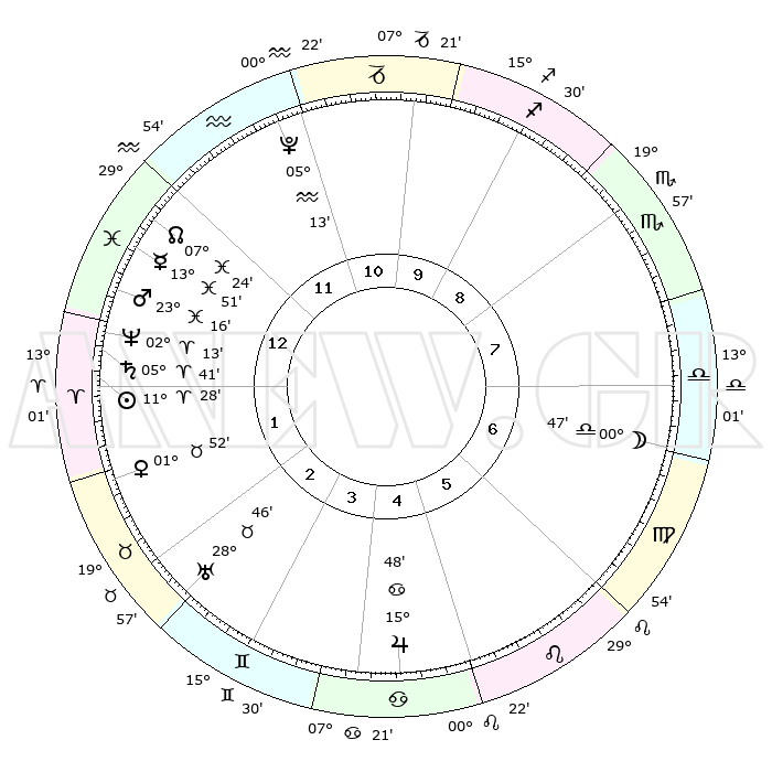 | | ΘΕΣΕΙΣ ΠΛΑΝΗΤΩΝ ΑΣΤΡΟΛΟΓΙΚΟΥ ΧΑΡΤΗ ΤΗΣ ΣΤΙΓΜΗΣ ΑΥΤΗΣ | | | | Πλανήτης | Ζώδιο | Μοίρες | Δεκαήμ. | Σε οίκο | Απόκλιση | | Ακμές των οίκων | | Ηλιος | Κριός | 11°24' | Δεύτερο | 1 | 04 N 31 | | 1ος | 10°10' | Ιχθείς | | Σελήνη | Ζυγός | 00°04' | Πρώτο | 7 | 01 S 46 | | 2ος | 24°25' | Κριός | | Ερμής | Ιχθείς | 13°48' | Δεύτερο | 1 | 07 S 35 | | 3ος | 25°11' | Ταύρος | | Αφροδίτη | Ταύρος | 01°48' | Πρώτο | 2 | 11 N 41 | | 4ος | 18°41' | Δίδυμοι | | Αρης | Ιχθείς | 23°13' | Τρίτο | 1 | 03 S 39 | | 5ος | 10°25' | Καρκίνος | | Δίας | Καρκίνος | 15°47' | Δεύτερο | 5 | 22 N 52 | | 6ος | 05°07' | Λέων | | Κρόνος | Κριός | 05°41' | Πρώτο | 1 | 00 N 18 | | 7ος | 10°10' | Παρθένος | | Ουρανός | Ταύρος | 28°46' | Τρίτο | 3 | 19 N 43 | | 8ος | 24°25' | Ζυγός | | Ποσειδώνας | Κριός | 02°13' | Πρώτο | 1 | 00 S 19 | | 9ος | 25°11' | Σκορπιός | | Πλούτωνας | Υδροχόος | 05°13' | Πρώτο | 12 | 22 S 47 | | 10ος | 18°41' | Τοξότης | | Β. Δεσμός | Ιχθείς | 07°24' | Πρώτο | 12 | 08 S 48 | | 11ος | 10°25' | Αιγόκερως | | Ωροσκόπος | Ιχθείς | 10°10' | Δεύτερο | | | 12ος | 05°07' | Υδροχόος | | Μεσουράνημα | Τοξότης | 18°41' | Δεύτερο | | | |