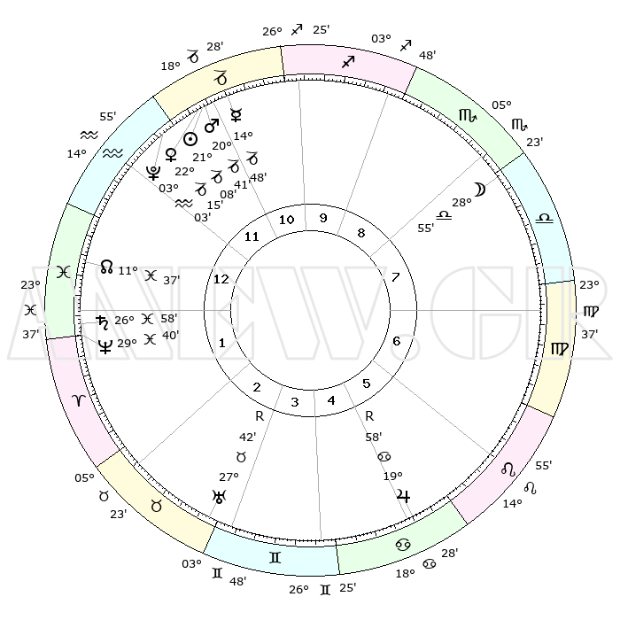 | | ΘΕΣΕΙΣ ΠΛΑΝΗΤΩΝ ΑΣΤΡΟΛΟΓΙΚΟΥ ΧΑΡΤΗ ΤΗΣ ΣΤΙΓΜΗΣ ΑΥΤΗΣ | | | | Πλανήτης | Ζώδιο | Μοίρες | Δεκαήμ. | Σε οίκο | Απόκλιση | | Ακμές των οίκων | | Ηλιος | Αιγόκερως | 20°42' | Τρίτο | 3 | 21 S 50 | | 1ος | 20°19' | Ζυγός | | Σελήνη | Ζυγός | 23°54' | Τρίτο | 1 | 12 S 33 | | 2ος | 18°11' | Σκορπιός | | Ερμής | Αιγόκερως | 14°08' | Δεύτερο | 3 | 24 S 11 | | 3ος | 19°29' | Τοξότης | | Αφροδίτη | Αιγόκερως | 21°44' | Τρίτο | 3 | 22 S 31 | | 4ος | 23°06' | Αιγόκερως | | Αρης | Αιγόκερως | 20°21' | Τρίτο | 3 | 22 S 50 | | 5ος | 26°03' | Υδροχόος | | Δίας | Καρκίνος | 20°01'R | Τρίτο | 9 | 22 N 12 | | 6ος | 25°29' | Ιχθείς | | Κρόνος | Ιχθείς | 26°56' | Τρίτο | 6 | 03 S 16 | | 7ος | 20°19' | Κριός | | Ουρανός | Ταύρος | 27°42'R | Τρίτο | 8 | 19 N 27 | | 8ος | 18°10' | Ταύρος | | Ποσειδώνας | Ιχθείς | 29°40' | Τρίτο | 6 | 01 S 21 | | 9ος | 19°29' | Δίδυμοι | | Πλούτωνας | Υδροχόος | 03°02' | Πρώτο | 4 | 23 S 09 | | 10ος | 23°06' | Καρκίνος | | Β. Δεσμός | Ιχθείς | 11°39' | Δεύτερο | 5 | 07 S 12 | | 11ος | 26°03' | Λέων | | Ωροσκόπος | Ζυγός | 20°19' | Τρίτο | | | 12ος | 25°29' | Παρθένος | | Μεσουράνημα | Καρκίνος | 23°06' | Τρίτο | | | |