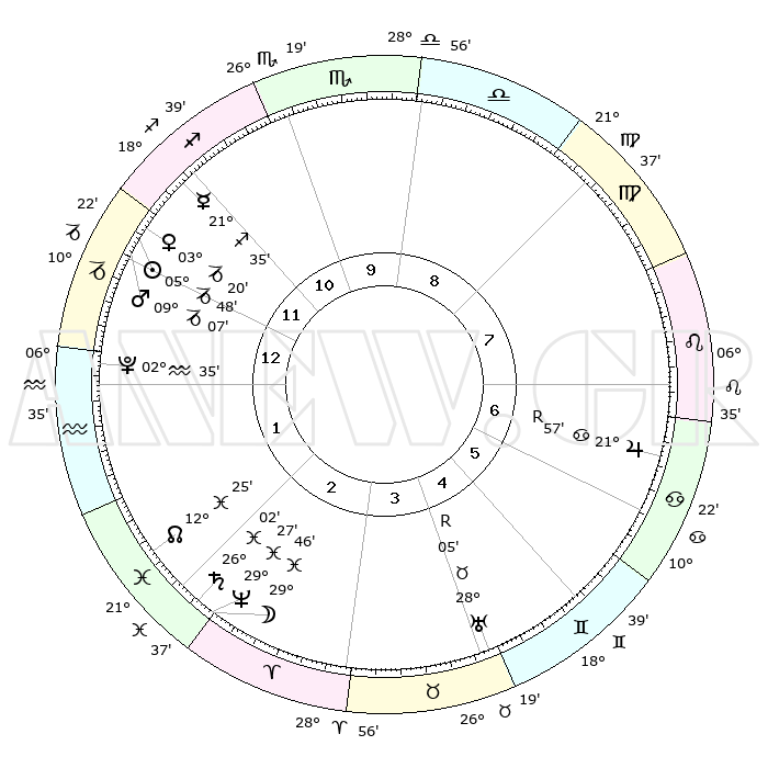 | | ΘΕΣΕΙΣ ΠΛΑΝΗΤΩΝ ΑΣΤΡΟΛΟΓΙΚΟΥ ΧΑΡΤΗ ΤΗΣ ΣΤΙΓΜΗΣ ΑΥΤΗΣ | | | | Πλανήτης | Ζώδιο | Μοίρες | Δεκαήμ. | Σε οίκο | Απόκλιση | | Ακμές των οίκων | | Ηλιος | Αιγόκερως | 05°43' | Πρώτο | 12 | 23 S 19 | | 1ος | 07°00' | Αιγόκερως | | Σελήνη | Ιχθείς | 28°45' | Τρίτο | 3 | 00 N 54 | | 2ος | 15°57' | Υδροχόος | | Ερμής | Τοξότης | 21°29' | Τρίτο | 12 | 23 S 11 | | 3ος | 26°14' | Ιχθείς | | Αφροδίτη | Αιγόκερως | 03°14' | Πρώτο | 12 | 23 S 43 | | 4ος | 28°58' | Κριός | | Αρης | Αιγόκερως | 09°04' | Πρώτο | 1 | 23 S 59 | | 5ος | 24°14' | Ταύρος | | Δίας | Καρκίνος | 21°58'R | Τρίτο | 7 | 21 N 52 | | 6ος | 15°40' | Δίδυμοι | | Κρόνος | Ιχθείς | 26°02' | Τρίτο | 2 | 03 S 40 | | 7ος | 07°00' | Καρκίνος | | Ουρανός | Ταύρος | 28°05'R | Τρίτο | 5 | 19 N 32 | | 8ος | 15°57' | Λέων | | Ποσειδώνας | Ιχθείς | 29°27' | Τρίτο | 3 | 01 S 27 | | 9ος | 26°14' | Παρθένος | | Πλούτωνας | Υδροχόος | 02°35' | Πρώτο | 1 | 23 S 15 | | 10ος | 28°58' | Ζυγός | | Β. Δεσμός | Ιχθείς | 12°25' | Δεύτερο | 2 | 06 S 54 | | 11ος | 24°14' | Σκορπιός | | Ωροσκόπος | Αιγόκερως | 07°00' | Πρώτο | | | 12ος | 15°40' | Τοξότης | | Μεσουράνημα | Ζυγός | 28°58' | Τρίτο | | | |