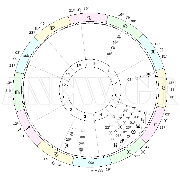 | | ΘΕΣΕΙΣ ΠΛΑΝΗΤΩΝ ΑΣΤΡΟΛΟΓΙΚΟΥ ΧΑΡΤΗ ΤΗΣ ΣΤΙΓΜΗΣ ΑΥΤΗΣ | | | | Πλανήτης | Ζώδιο | Μοίρες | Δεκαήμ. | Σε οίκο | Απόκλιση | | Ακμές των οίκων | | Ηλιος | Ιχθείς | 22°38' | Τρίτο | 12 | 02 S 55 | | 1ος | 00°06' | Κριός | | Σελήνη | Αιγόκερως | 12°29' | Δεύτερο | 10 | 27 S 13 | | 2ος | 10°22' | Ταύρος | | Ερμής | Ιχθείς | 11°28'R | Δεύτερο | 12 | 04 S 39 | | 3ος | 07°45' | Δίδυμοι | | Αφροδίτη | Κριός | 08°25' | Πρώτο | 1 | 02 N 20 | | 4ος | 00°03' | Καρκίνος | | Αρης | Ιχθείς | 08°22' | Πρώτο | 12 | 09 S 26 | | 5ος | 22°22' | Καρκίνος | | Δίας | Καρκίνος | 15°06' | Δεύτερο | 4 | 22 N 56 | | 6ος | 19°47' | Λέων | | Κρόνος | Κριός | 03°19' | Πρώτο | 1 | 00 S 38 | | 7ος | 00°06' | Ζυγός | | Ουρανός | Ταύρος | 28°03' | Τρίτο | 2 | 19 N 33 | | 8ος | 10°22' | Σκορπιός | | Ποσειδώνας | Κριός | 01°30' | Πρώτο | 1 | 00 S 36 | | 9ος | 07°45' | Τοξότης | | Πλούτωνας | Υδροχόος | 04°51' | Πρώτο | 11 | 22 S 50 | | 10ος | 00°03' | Αιγόκερως | | Β. Δεσμός | Ιχθείς | 08°24' | Πρώτο | 12 | 08 S 25 | | 11ος | 22°22' | Αιγόκερως | | Ωροσκόπος | Κριός | 00°06' | Πρώτο | | | 12ος | 19°47' | Υδροχόος | | Μεσουράνημα | Αιγόκερως | 00°03' | Πρώτο | | | |